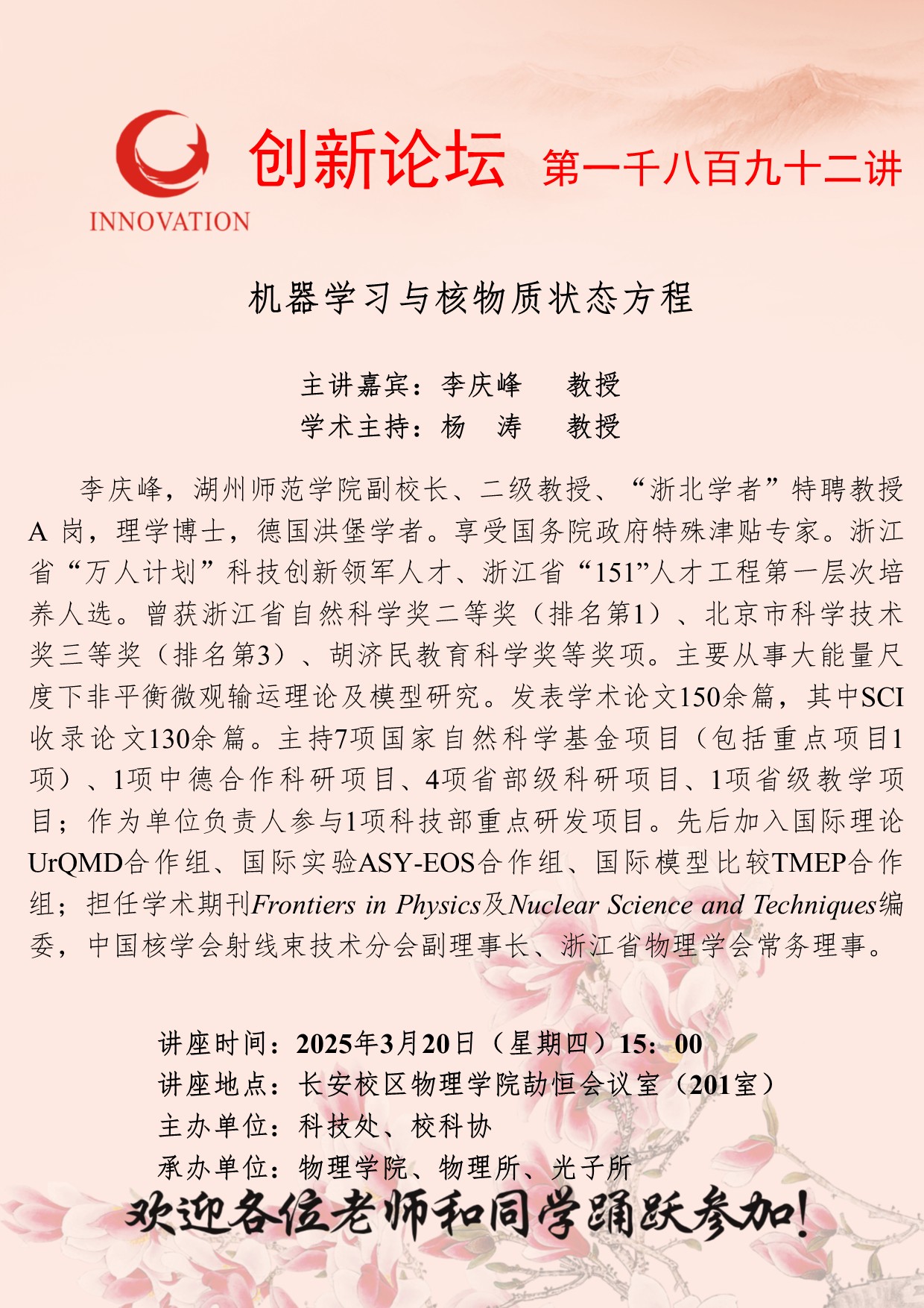 李庆峰 教授 乐鱼网页版页面登录创新论坛第一千八百九十二讲:机器学习与核物质状态方程 讲座时间 2025年3月20日(星期四)15:00 讲座地点 长安校区物理学院劼恒会议室(201室) 讲座人介绍 李庆峰 教授 讲座内容