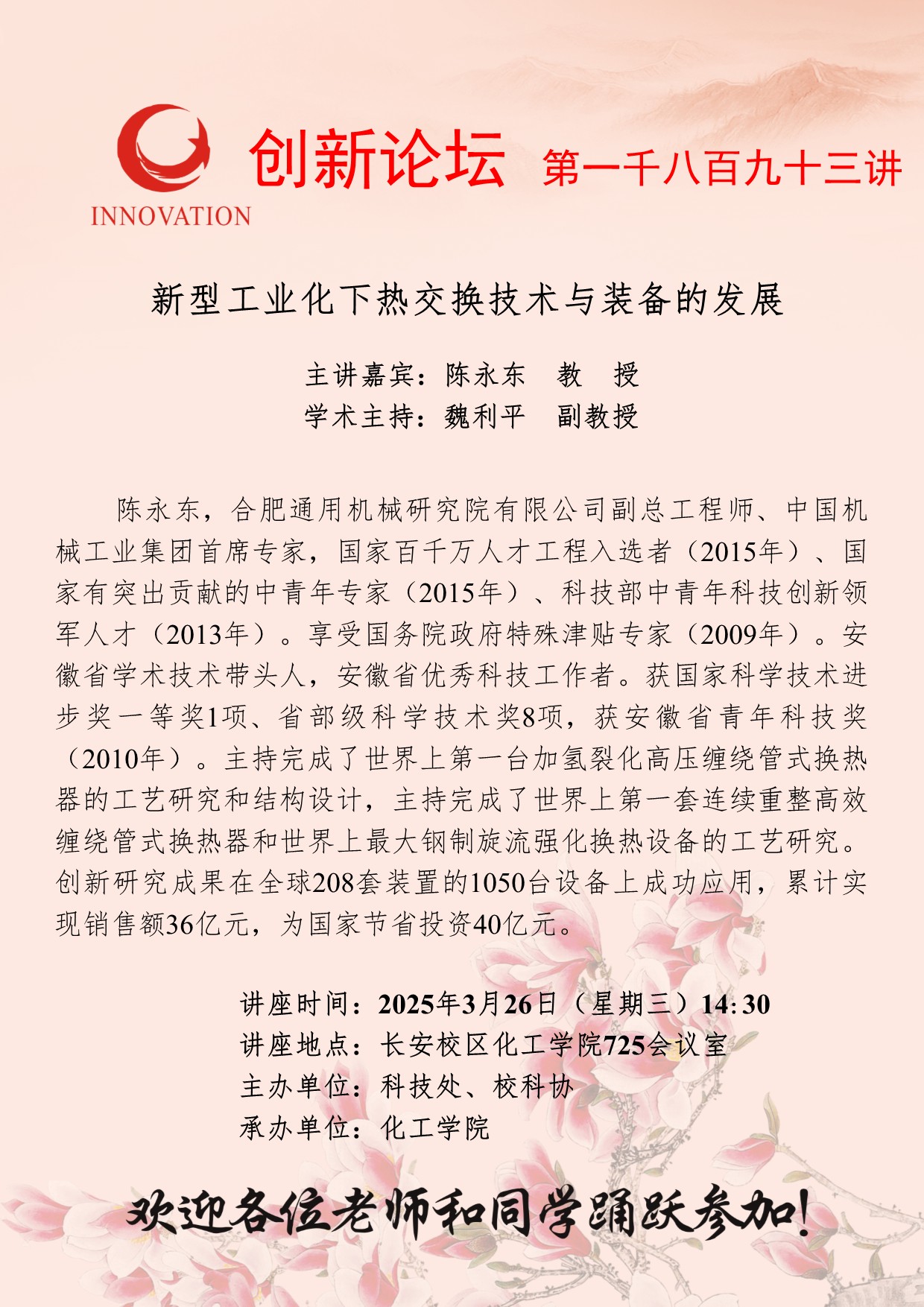 陈永东 教授 乐鱼网页版页面登录创新论坛第一千八百九十三讲:新型工业化下热交换技术与装备的发展 讲座时间 2025年3月26日(星期三)14:30 讲座地点 长安校区化工学院725会议室 讲座人介绍 陈永东 教授 讲座内容