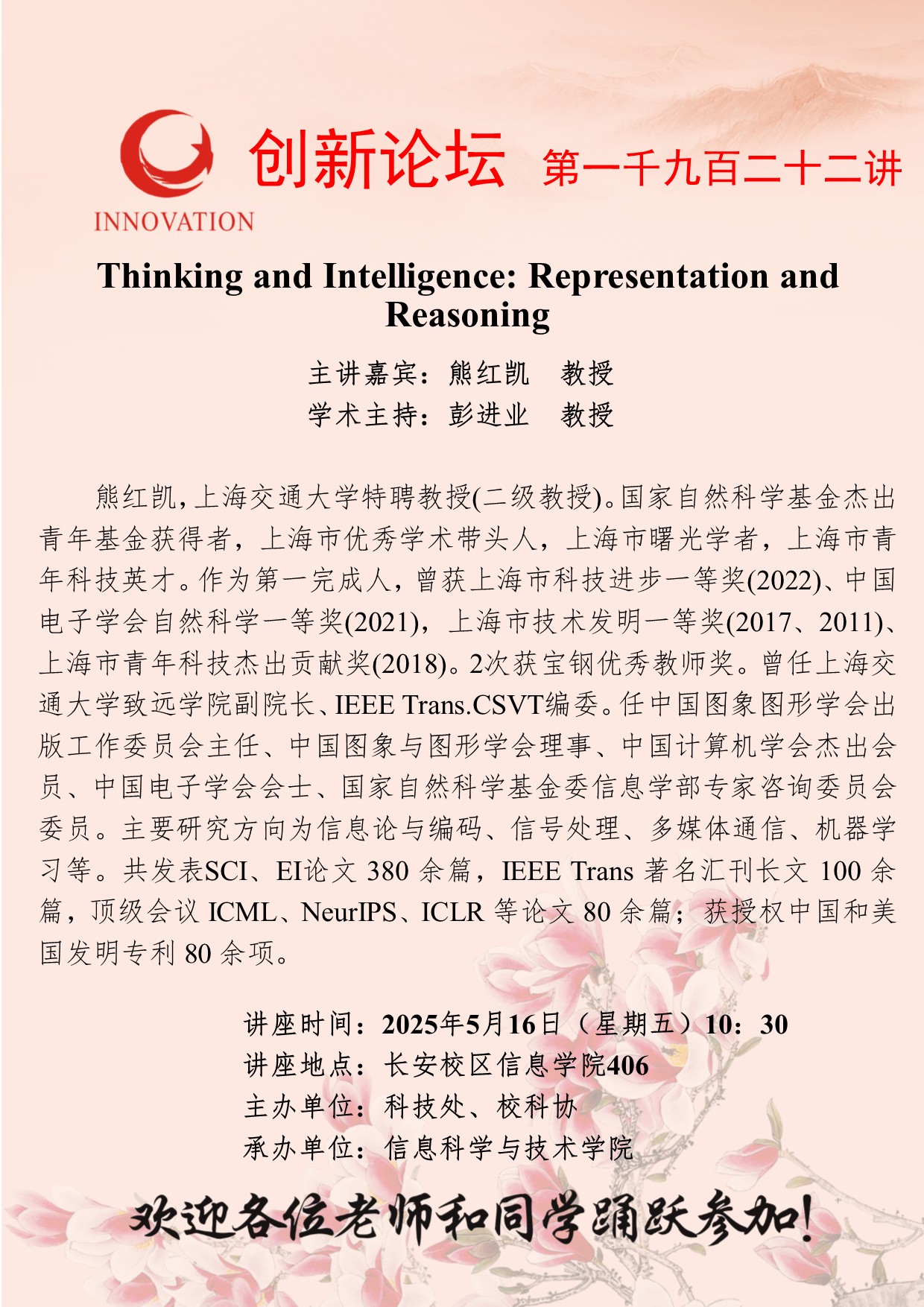 熊红凯 教授 乐鱼网页版页面登录创新论坛第一千九百二十二讲:Thinking and Intelligence: Representation and Reasoning 讲座时间 2025年5月16日(星期五)10:30 讲座地点 长安校区信息学院406 讲座人介绍 熊红凯 教授 讲座内容