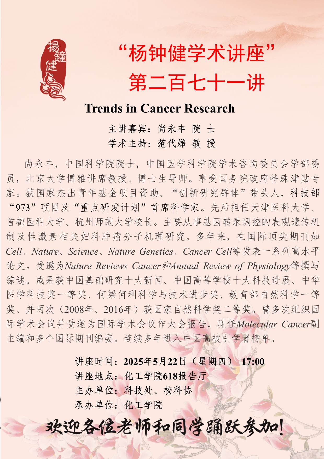 “杨钟健学术讲座”第二百七十一讲:Trends in Cancer Research