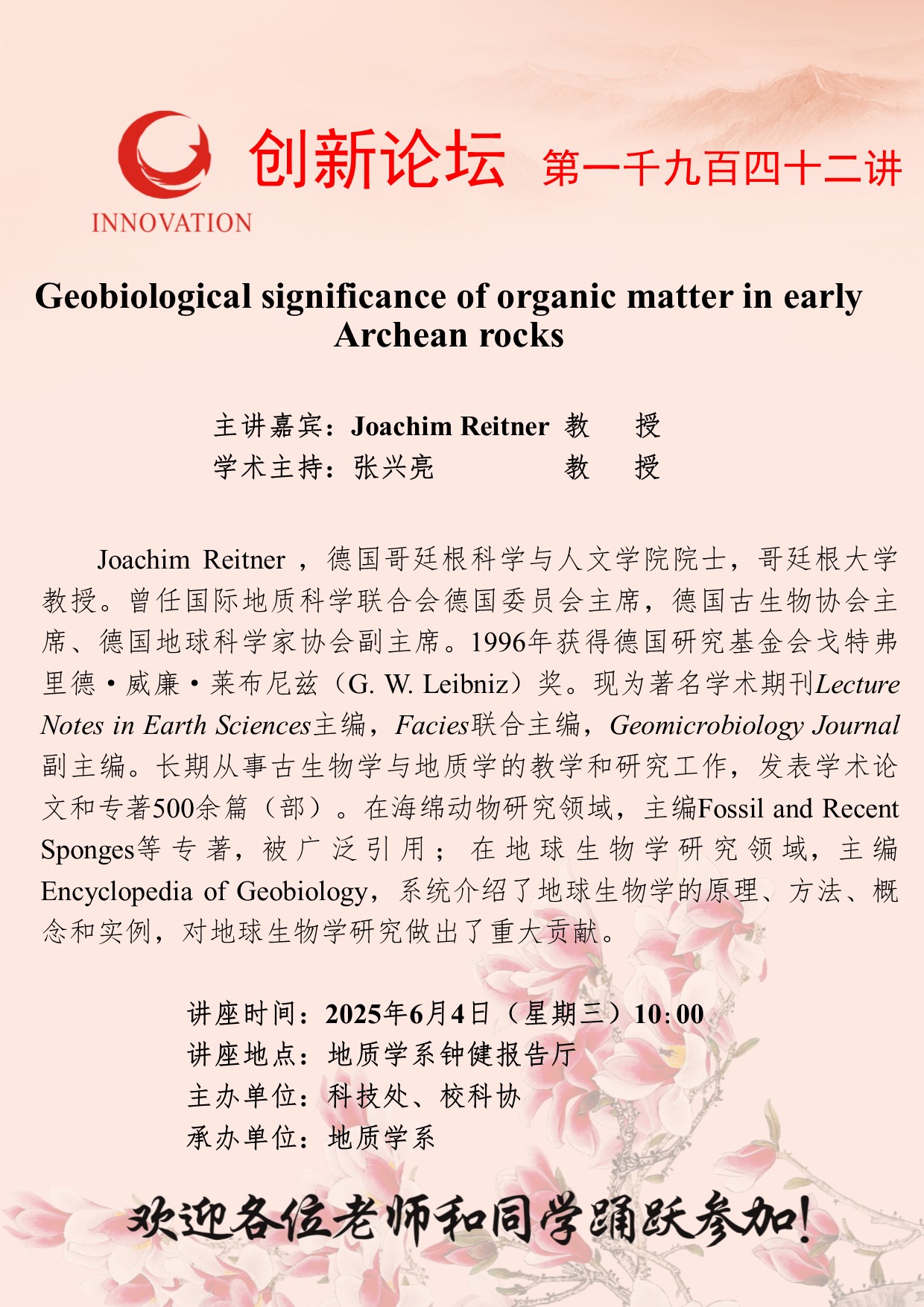 Joachim Reitner 教授 乐鱼网页版页面登录创新论坛第一千九百四十二讲:Geobiological significance of organic matter in early Archean rocks 讲座时间 2025年6月4日(星期三)10:00 讲座地点 地质学系钟健报告厅 讲座人介绍 Joachim Reitner 教授 讲座内容