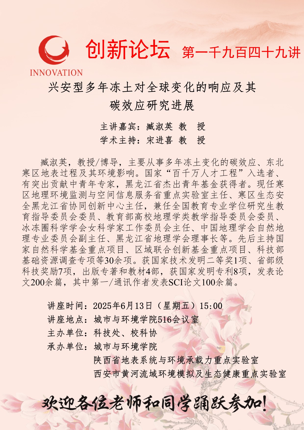 臧淑英 教授 乐鱼网页版页面登录创新论坛第一千九百四十九讲:兴安型多年冻土对全球变化的响应及其碳效应研究进展 讲座时间 2025年6月13日(星期五)15:00 讲座地点 城市与环境学院516会议室 讲座人介绍 臧淑英 教授 讲座内容