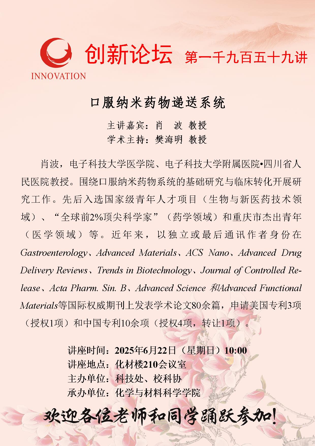 乐鱼网页版页面登录创新论坛第一千九百五十九讲: 口服纳米药物递送系统