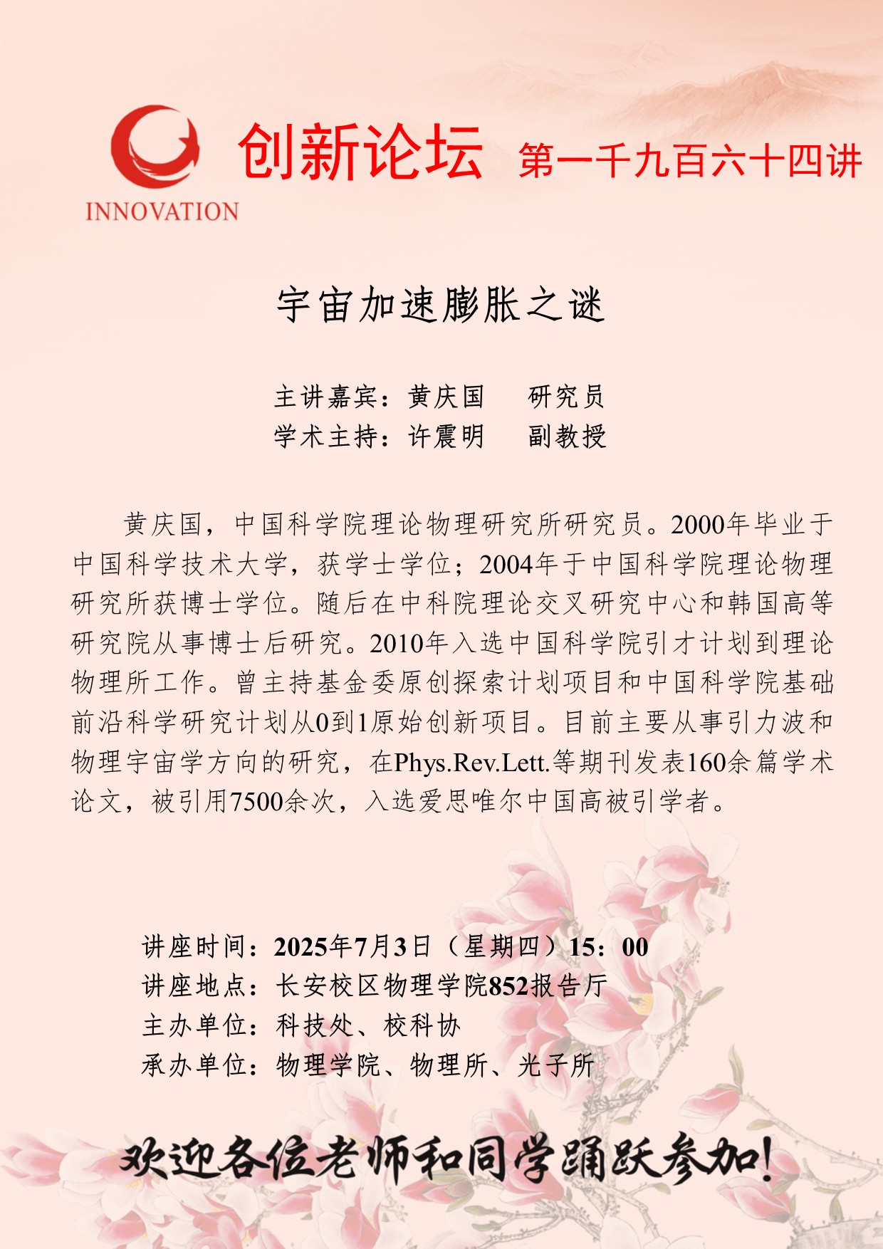 黄庆国 研究员 乐鱼网页版页面登录创新论坛第一千九百六十四讲:宇宙加速膨胀之谜 讲座时间 2025年7月3日(星期四)15:00 讲座地点 长安校区物理学院852报告厅 讲座人介绍 黄庆国 研究员 讲座内容