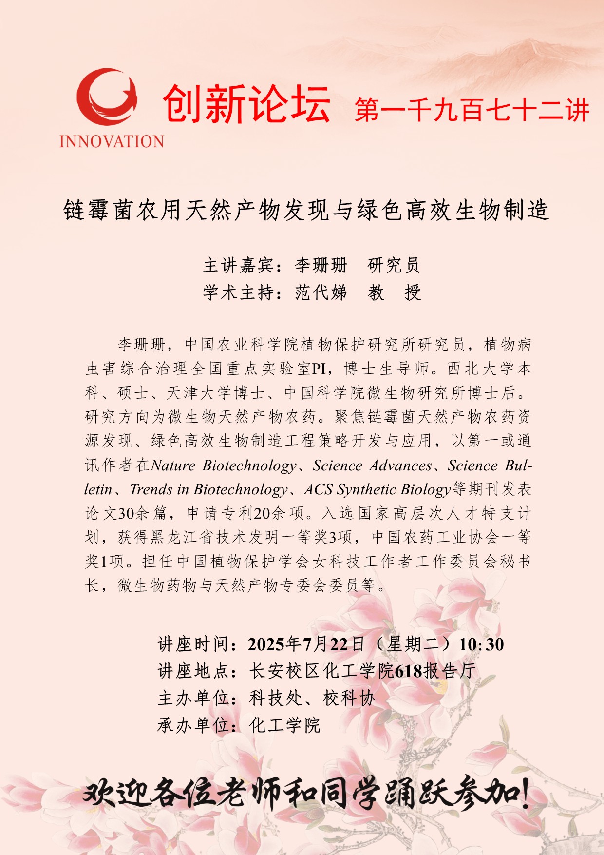 李珊珊 研究员 乐鱼网页版页面登录创新论坛第一千九百七十二讲:链霉菌农用天然产物发现与绿色高效生物制造 讲座时间 2025年7月22日(星期二)10:30 讲座地点 长安校区化工学院618报告厅 讲座人介绍 李珊珊 研究员 讲座内容