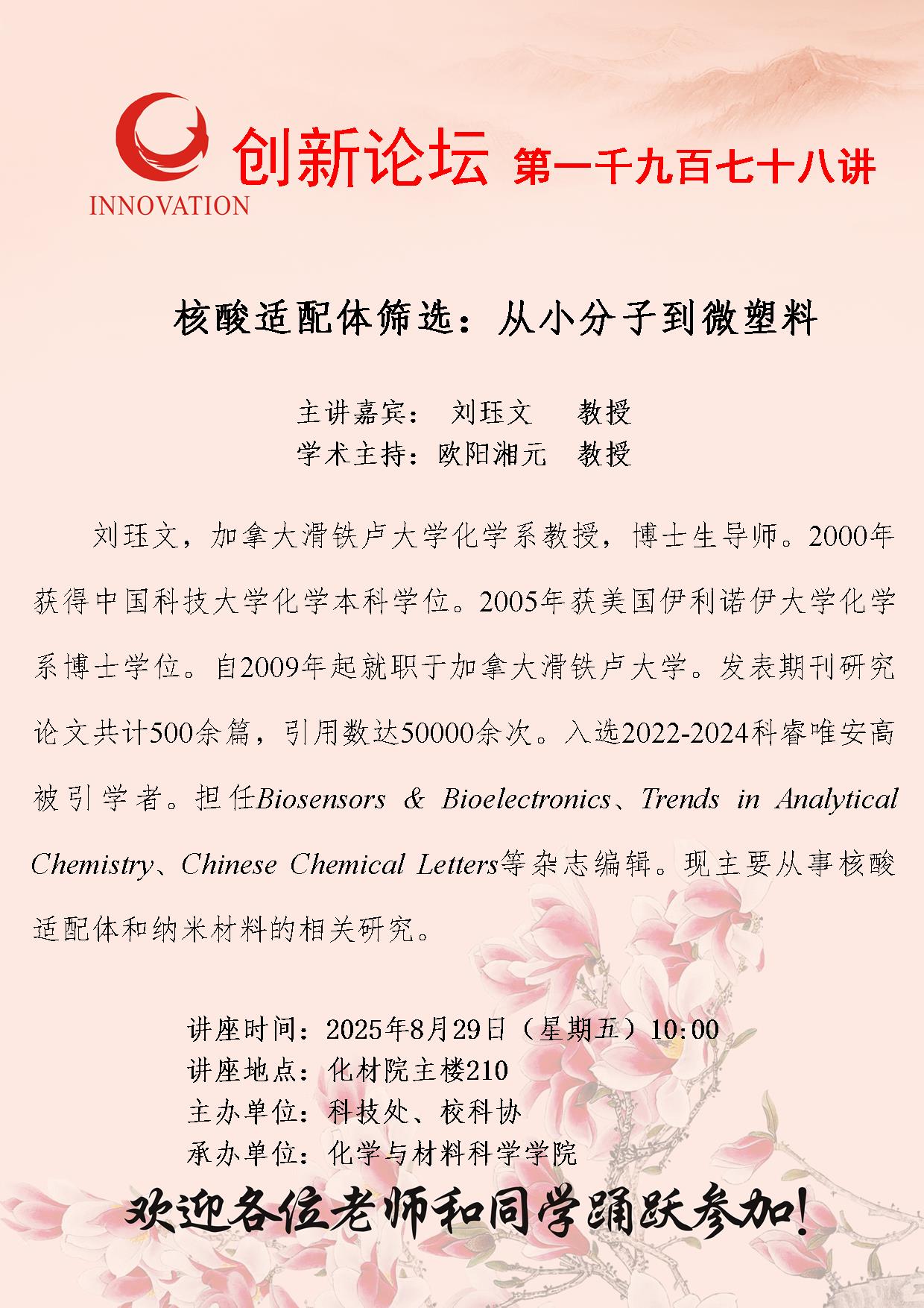 刘珏文 教授 乐鱼网页版页面登录创新论坛第一千九百七十八讲:核酸适配体筛选:从小分子到微塑料 讲座时间 2025年8月29日(星期五)10:00 讲座地点 化材院主楼210 讲座人介绍 刘珏文 教授 讲座内容