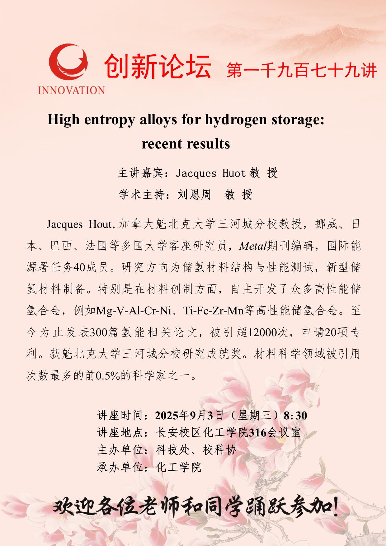 Jacques Huot 教授 乐鱼网页版页面登录创新论坛第一千九百七十九讲:High entropy alloys for hydrogen storage: recent results 讲座时间 2025年9月3日(星期三)8:30 讲座地点 长安校区化工学院316会议室 讲座人介绍 Jacques Huot 教授 讲座内容