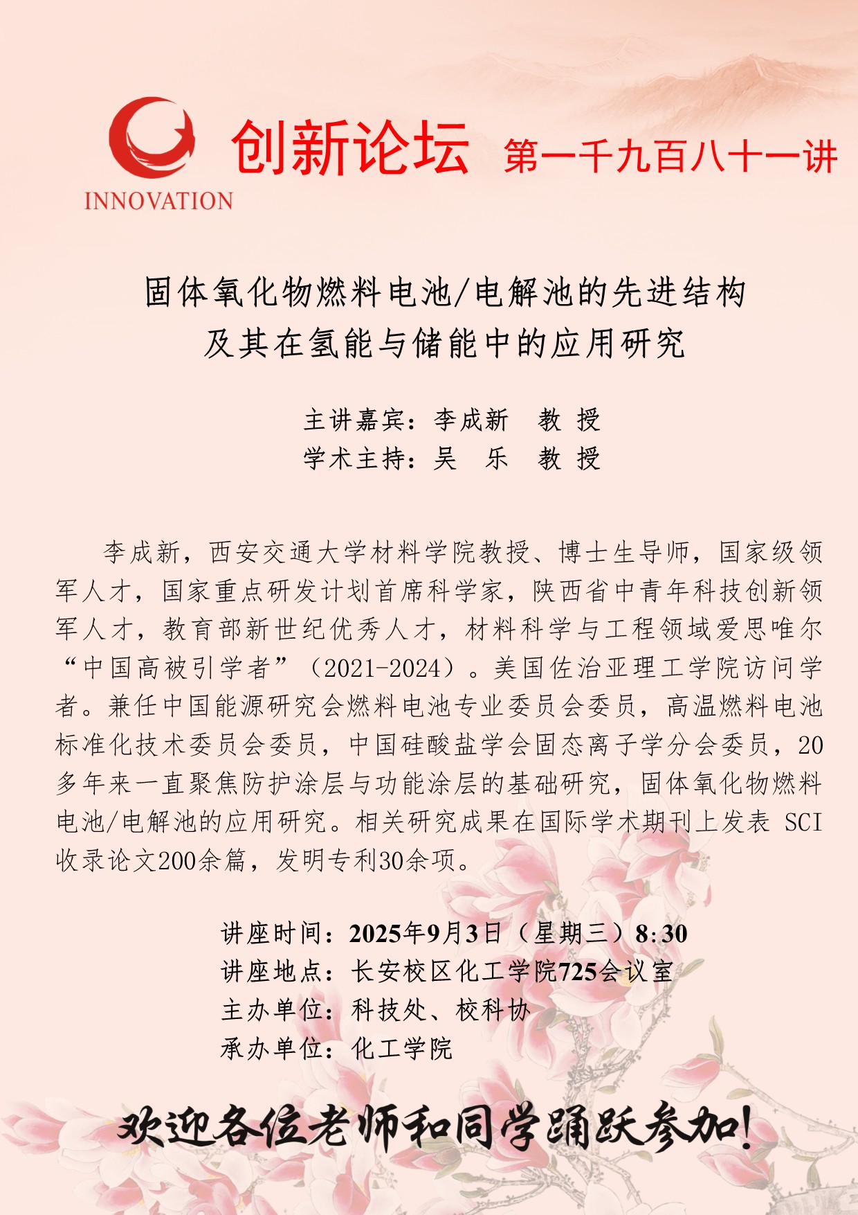 李成新 教授 乐鱼网页版页面登录创新论坛第一千九百八十一讲:固体氧化物燃料电池/电解池的先进结构及其在氢能与储能中的应用研究 讲座时间 2025年9月3日(星期三)8:30 讲座地点 长安校区化工学院725会议室 讲座人介绍 李成新 教授 讲座内容