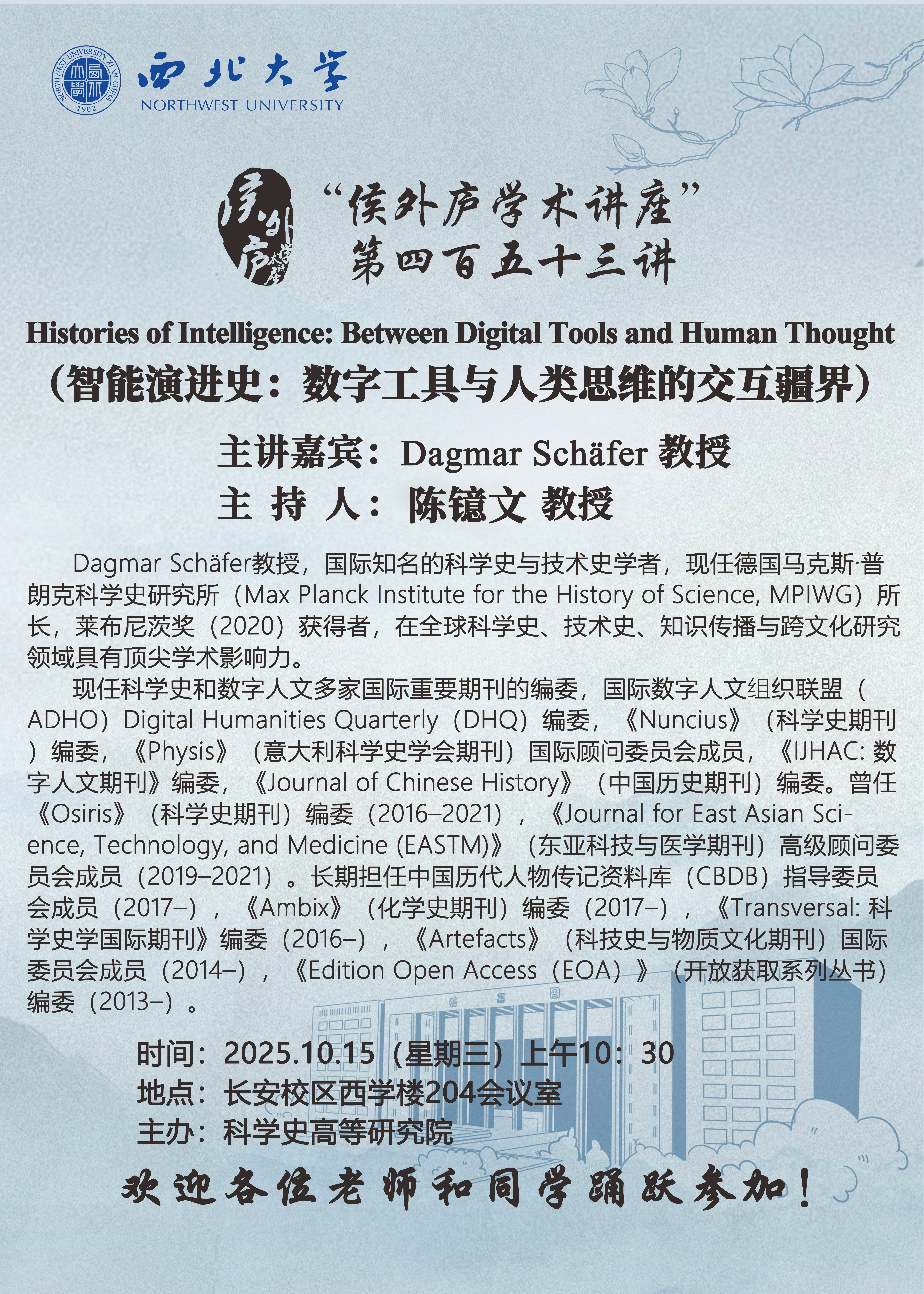 Dagmar Schafer教授 “侯外庐学术讲座”第四百五十三讲:Histories of Intelligence: Between Digital Tools and Human Thought(智能演进史:数字工具与人类思维的交互疆界) 讲座时间 2025.10.15(星期三)上午10:30 讲座地点 长安校区西学楼204会议室 讲座人介绍 Dagmar Schafer教授 讲座内容