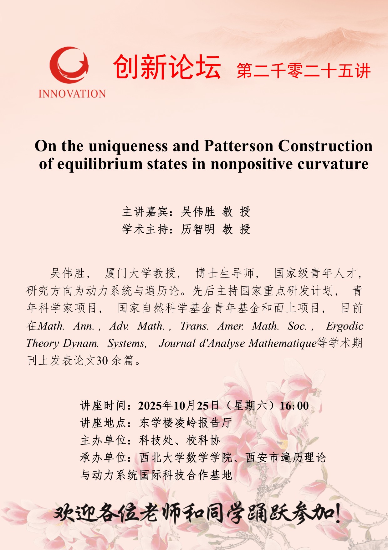 吴伟胜 教 授 乐鱼网页版页面登录创新论坛第二千零二十五讲:On the uniqueness and Patterson Construction of equilibrium states in nonpositive curvature 讲座时间 2025年10月25日(星期六)16:00 讲座地点 东学楼凌岭报告厅 讲座人介绍 吴伟胜 教 授 讲座内容