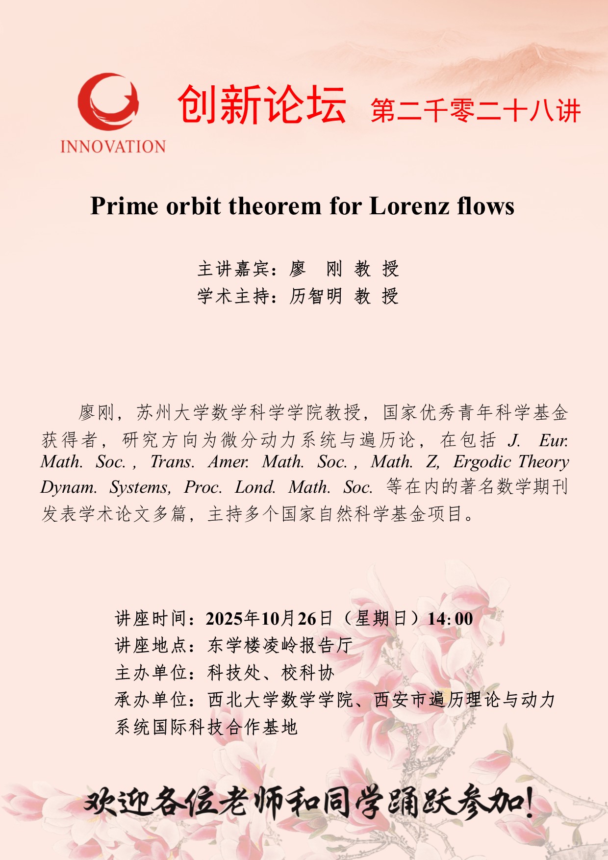 廖 刚 教 授 乐鱼网页版页面登录创新论坛第二千零二十八讲:Prime orbit theorem for Lorenz flows 讲座时间 2025年10月26日(星期日)14:00 讲座地点 东学楼凌岭报告厅 讲座人介绍 廖 刚 教 授 讲座内容
