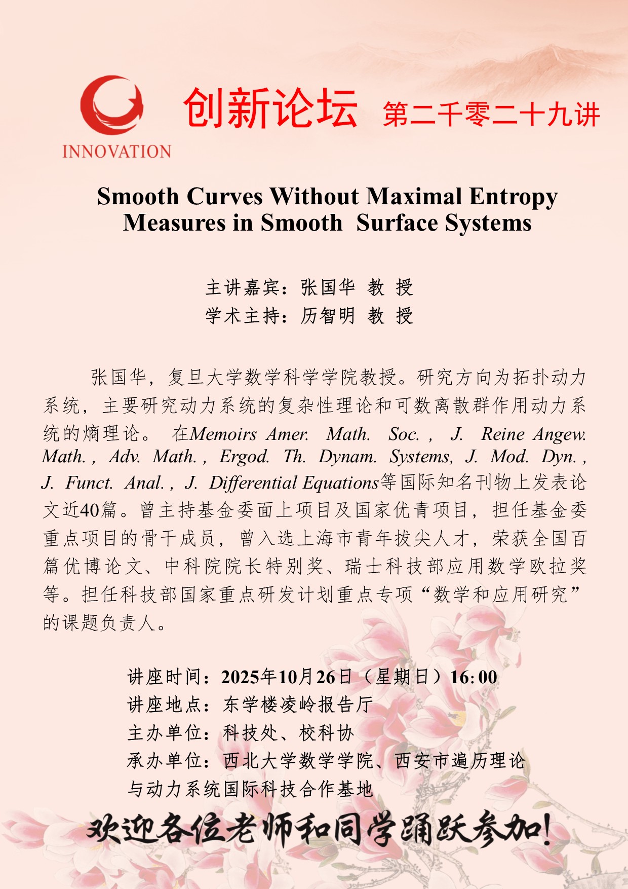 张国华 教 授 乐鱼网页版页面登录创新论坛第二千零二十九讲:Smooth Curves Without Maximal Entropy Measures in Smooth Surface Systems 讲座时间 2025年10月26日(星期日)16:00 讲座地点 东学楼凌岭报告厅 讲座人介绍 张国华 教 授 讲座内容