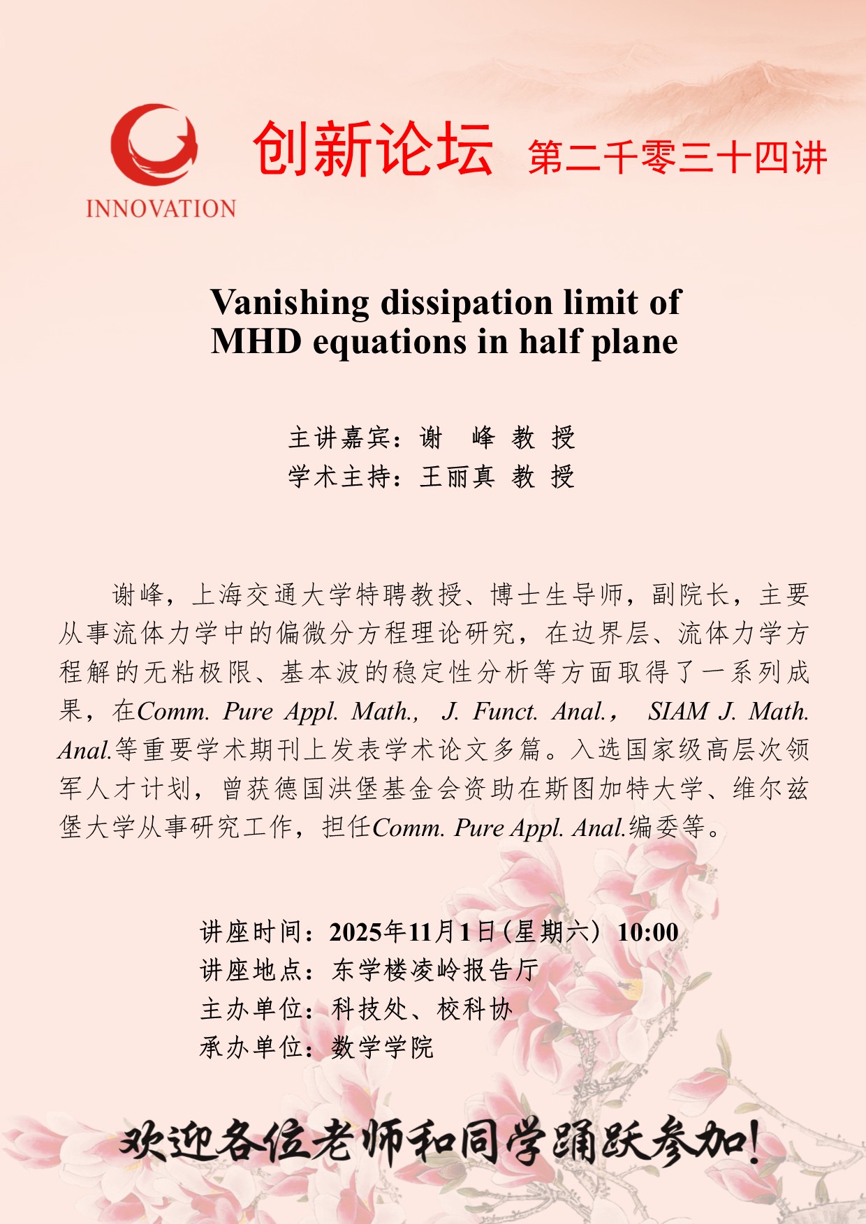 谢 峰 教 授 乐鱼网页版页面登录创新论坛第二千零三十四讲:Vanishing dissipation limit of MHD equations in half plane 讲座时间 2025年11月1日(星期六) 10:00 讲座地点 东学楼凌岭报告厅 讲座人介绍 谢 峰 教 授 讲座内容