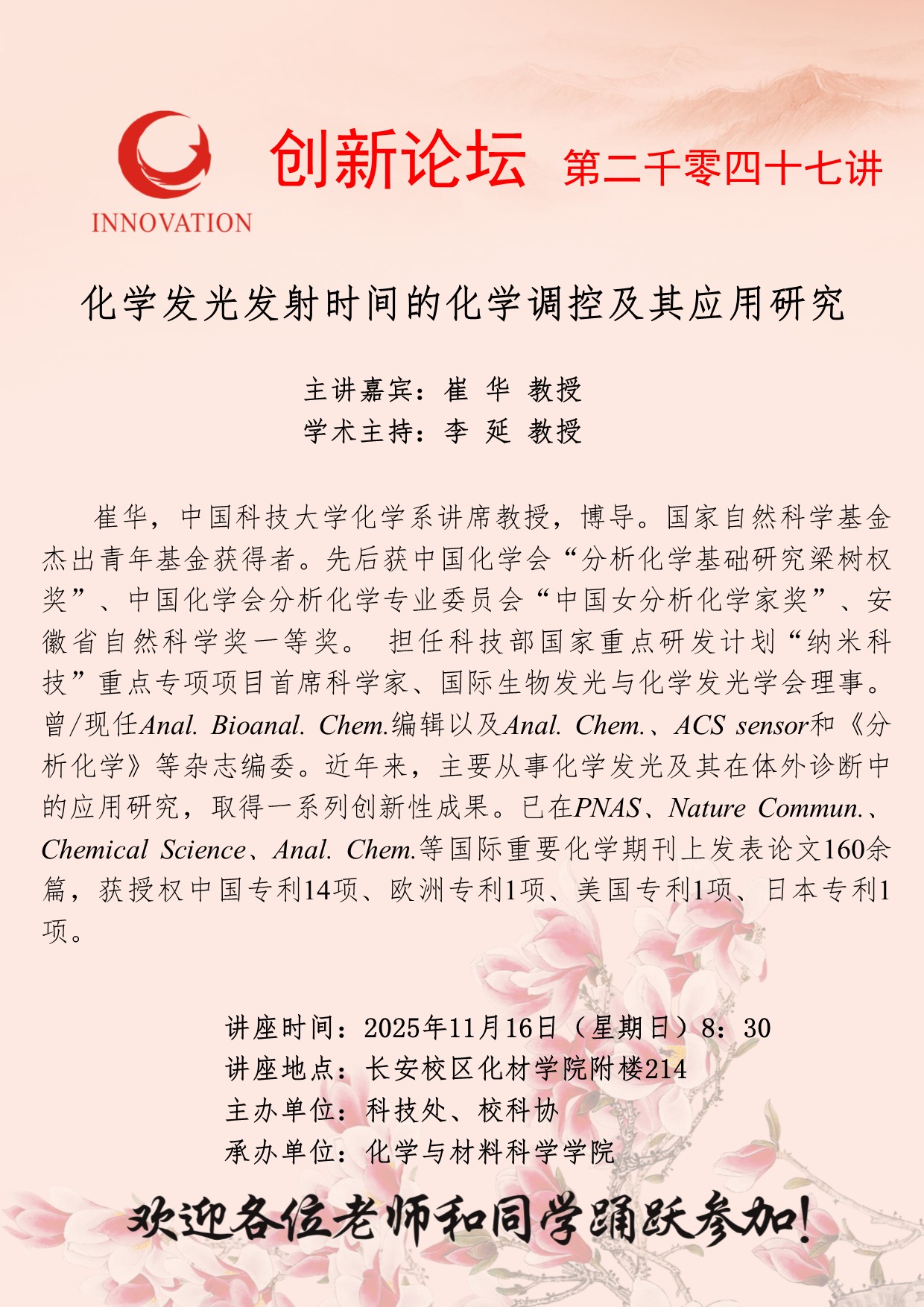 崔华 教授 乐鱼网页版页面登录创新论坛第二千零四十七讲:化学发光发射时间的化学调控及其应用研究 讲座时间 2025年11月16日(星期日)8:30 讲座地点 长安校区化材学院附楼214 讲座人介绍 崔华 教授 讲座内容
