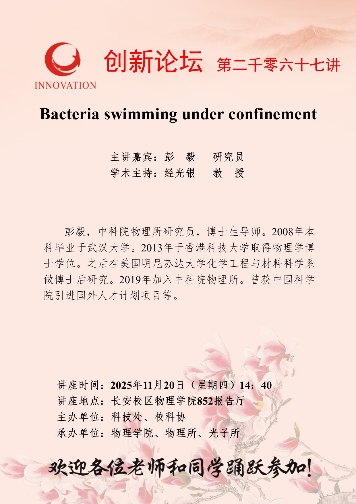 彭毅 研究员 乐鱼网页版页面登录创新论坛第二千零六十七讲:Bacteria swimming under confinement 讲座时间 2025年11月20日(星期四)14:40 讲座地点 长安校区物理学院852报告厅 讲座人介绍 彭毅 研究员 讲座内容