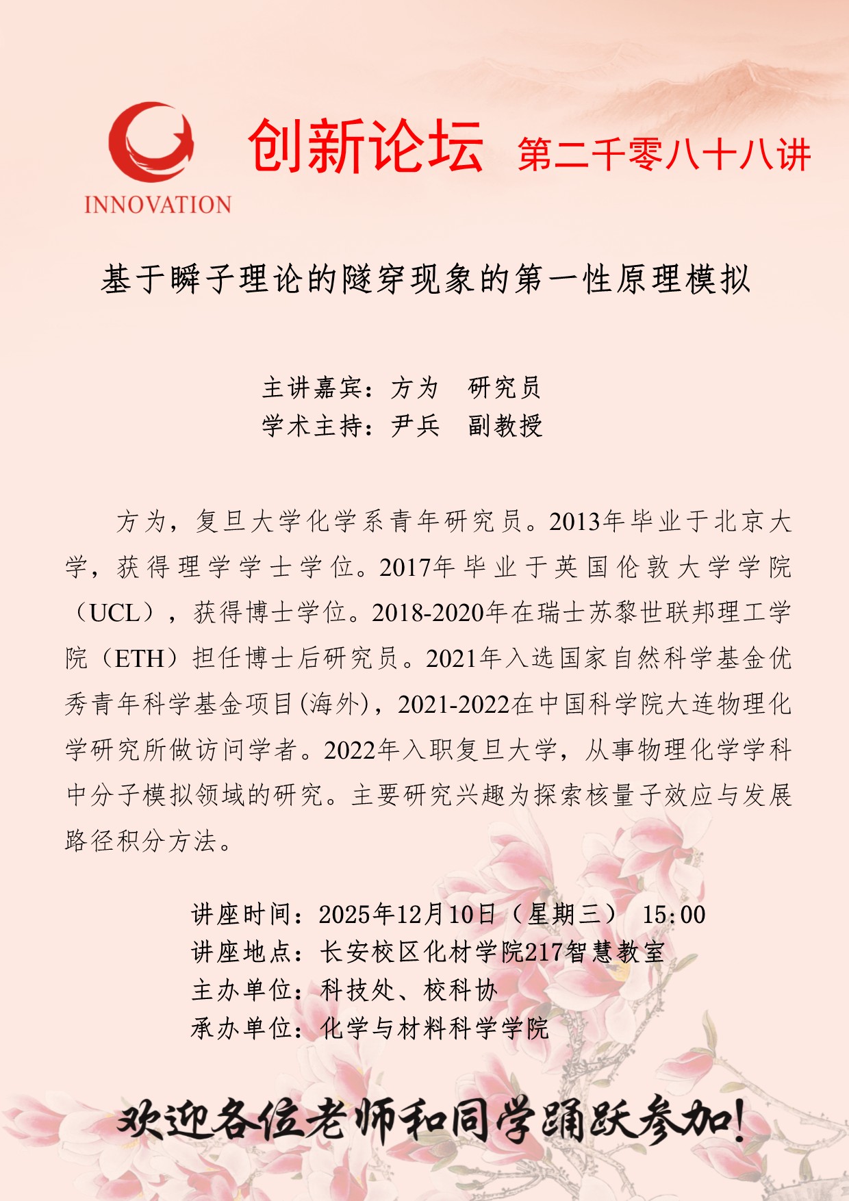 方为 研究员 乐鱼网页版页面登录创新论坛第二千零八十八讲:基于瞬子理论的隧穿现象的第一性原理模拟 讲座时间 2025年12月10日(星期三) 15:00 讲座地点 长安校区化材学院217智慧教室 讲座人介绍 方为 研究员 讲座内容
