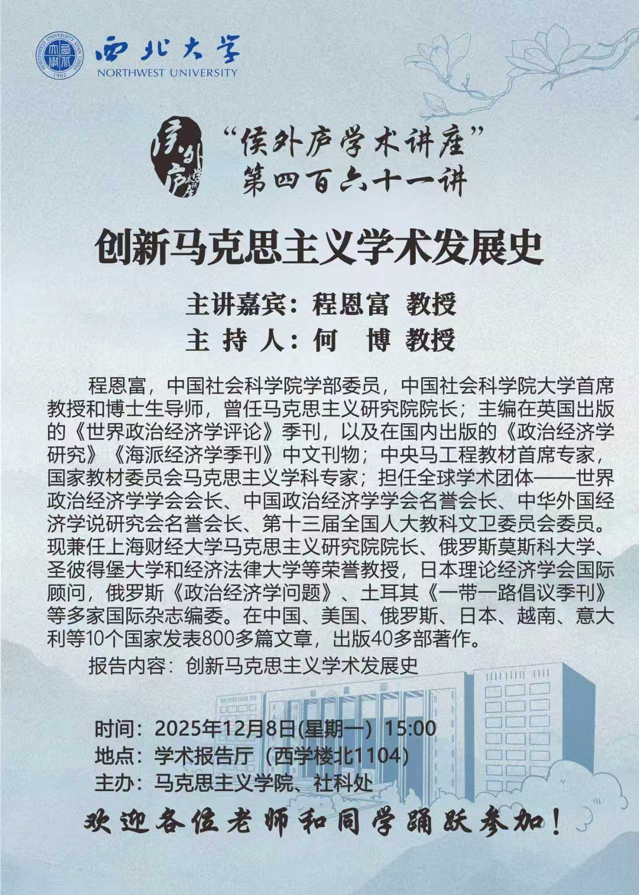程恩富 教授 “侯外庐学术讲座” 第四百六十一讲:创新马克思主义学术发展史 讲座时间 2025年12月8日(星期一)15:00 讲座地点 学术报告厅(西学楼北1104) 讲座人介绍 程恩富 教授 讲座内容