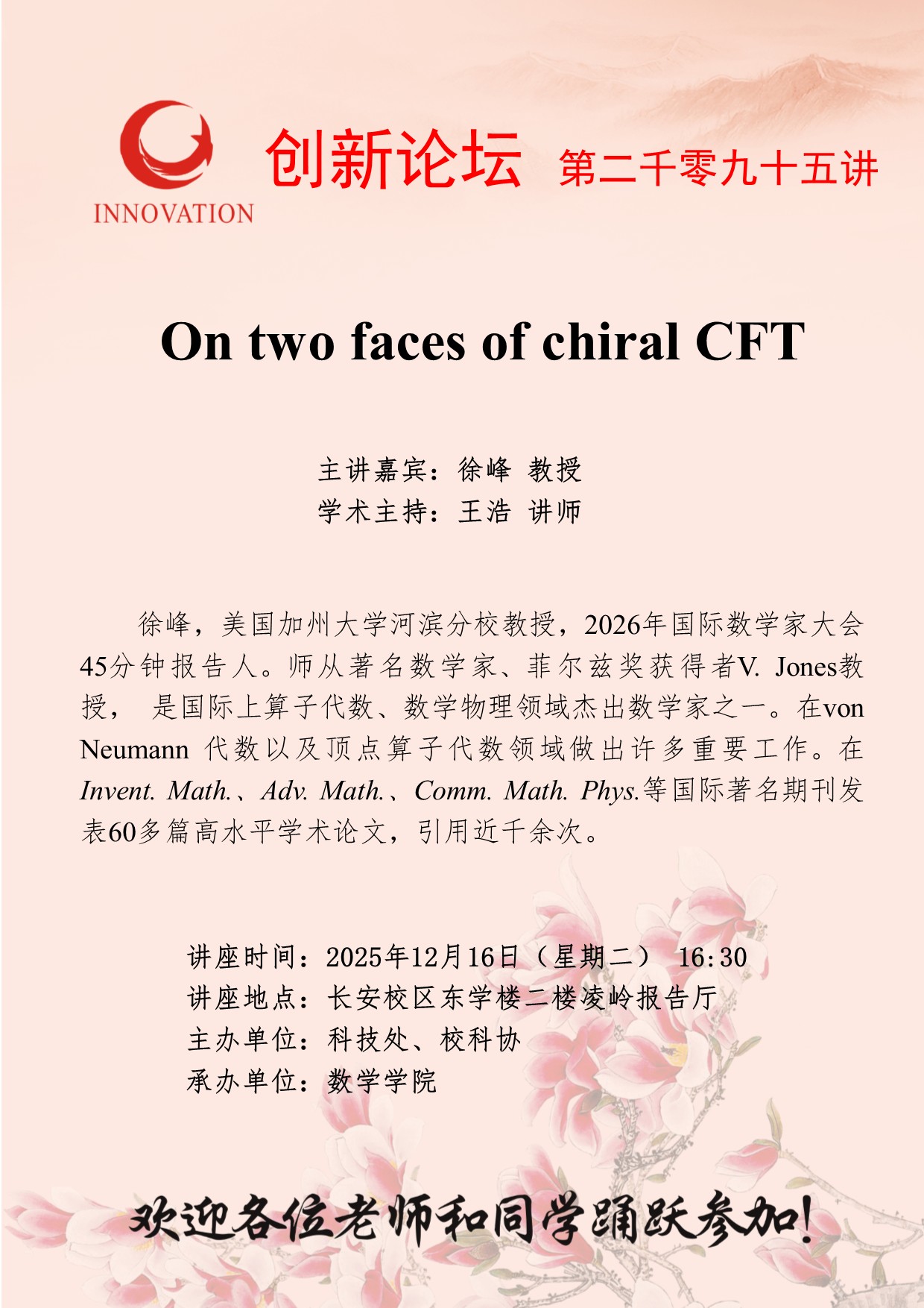 徐峰 教授 乐鱼网页版页面登录创新论坛第二千零九十五讲:On two faces of chiral CFT 讲座时间 2025年12月16日(星期二) 16:30 讲座地点 长安校区东学楼二楼凌岭报告厅 讲座人介绍 徐峰 教授 讲座内容