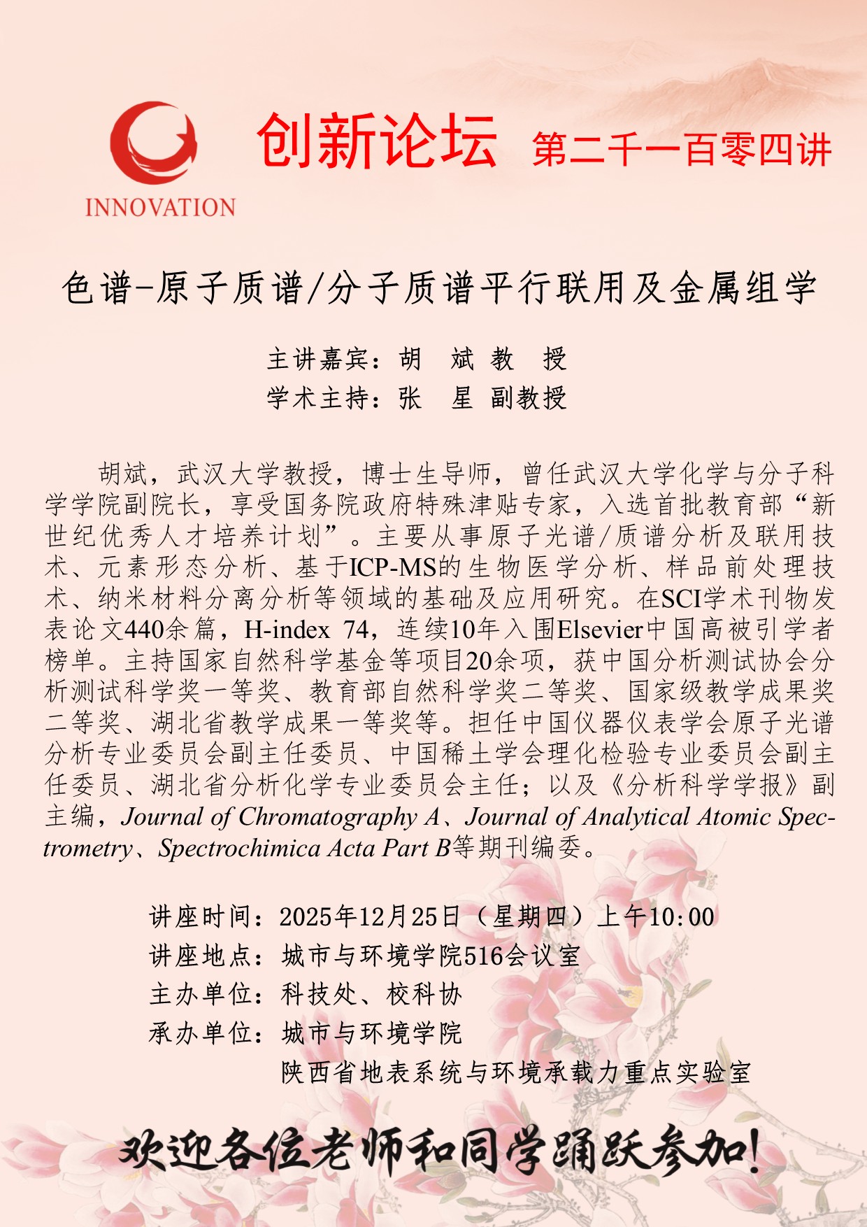 胡斌 教授 乐鱼网页版页面登录创新论坛第二千一百零四讲:色谱-原子质谱/分子质谱平行联用及金属组学 讲座时间 2025年12月25日(星期四)上午10:00 讲座地点 城市与环境学院516会议室 讲座人介绍 胡斌 教授 讲座内容