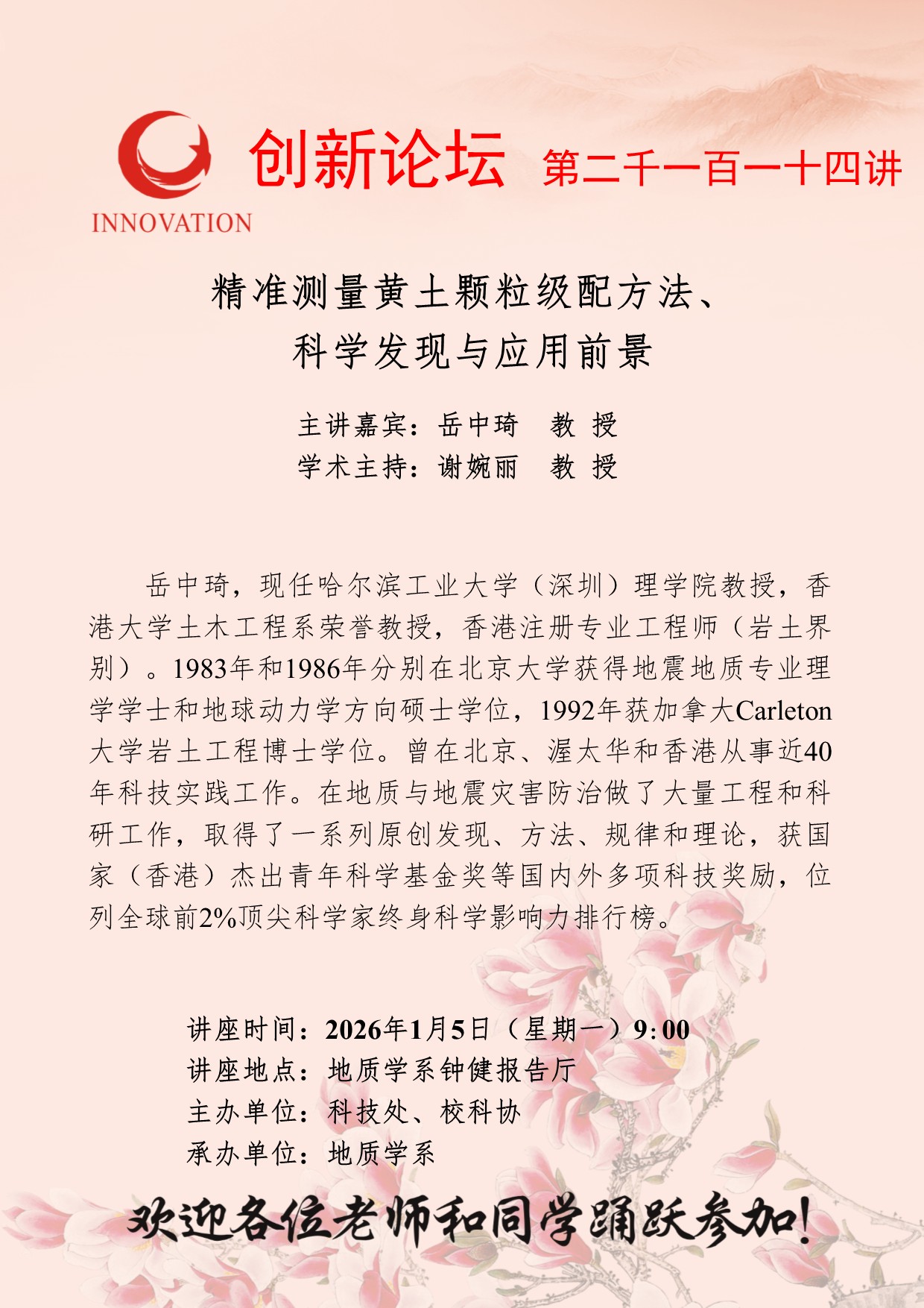 岳中琦 教授 乐鱼网页版页面登录创新论坛第二千一百一十四讲:精准测量黄土颗粒级配方法、 科学发现与应用前景 讲座时间 2026年1月5日(星期一)9:00 讲座地点 地质学系钟健报告厅 讲座人介绍 岳中琦 教授 讲座内容