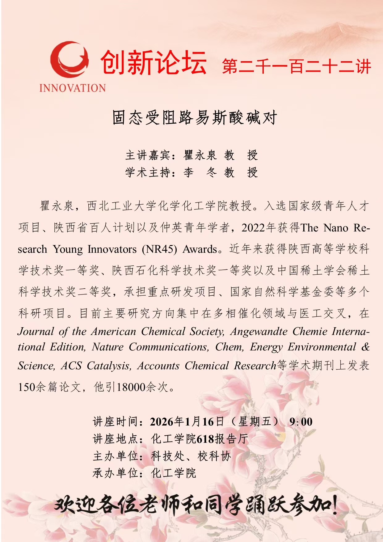 瞿永泉 教 授 乐鱼网页版页面登录创新论坛第二千一百二十二讲:固态受阻路易斯酸碱对 讲座时间 2026年1月16日(星期五) 9:00 讲座地点 化工学院618报告厅 讲座人介绍 瞿永泉 教 授 讲座内容