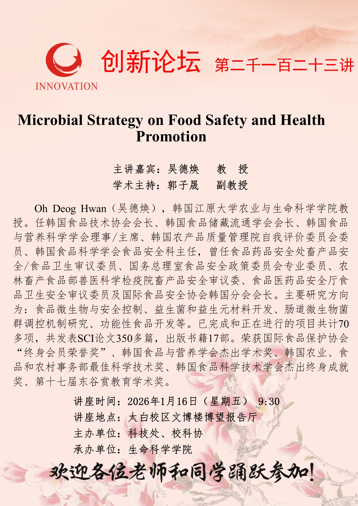 吴德焕 教授 乐鱼网页版页面登录创新论坛第二千一百二十三讲:Microbial Strategy on Food Safety and Health Promotion 讲座时间 2026年1月16日(星期五)9:30 讲座地点 太白校区文博楼博望报告厅 讲座人介绍 吴德焕 教授 讲座内容