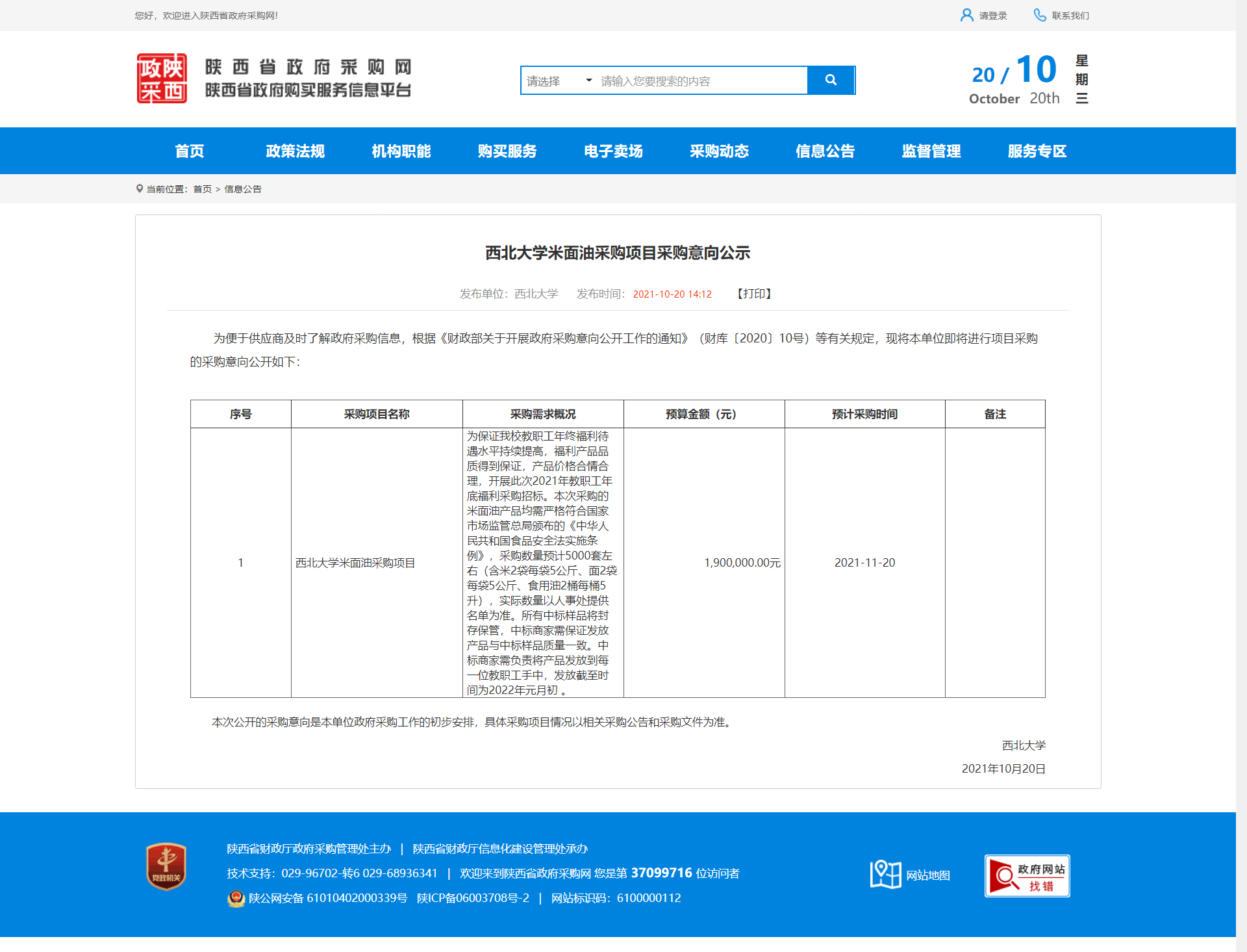 乐鱼网页版页面登录米面油采购项目采购意向公示 作者: 编辑:采购与招标办公室 时间:2021-10-20 原公告地址:http://www.ccgp-shaanxi.gov.cn/notice/noticeDetail.do?noticeguid=8a85be337c20d0b4017c9c4e47dd0a64