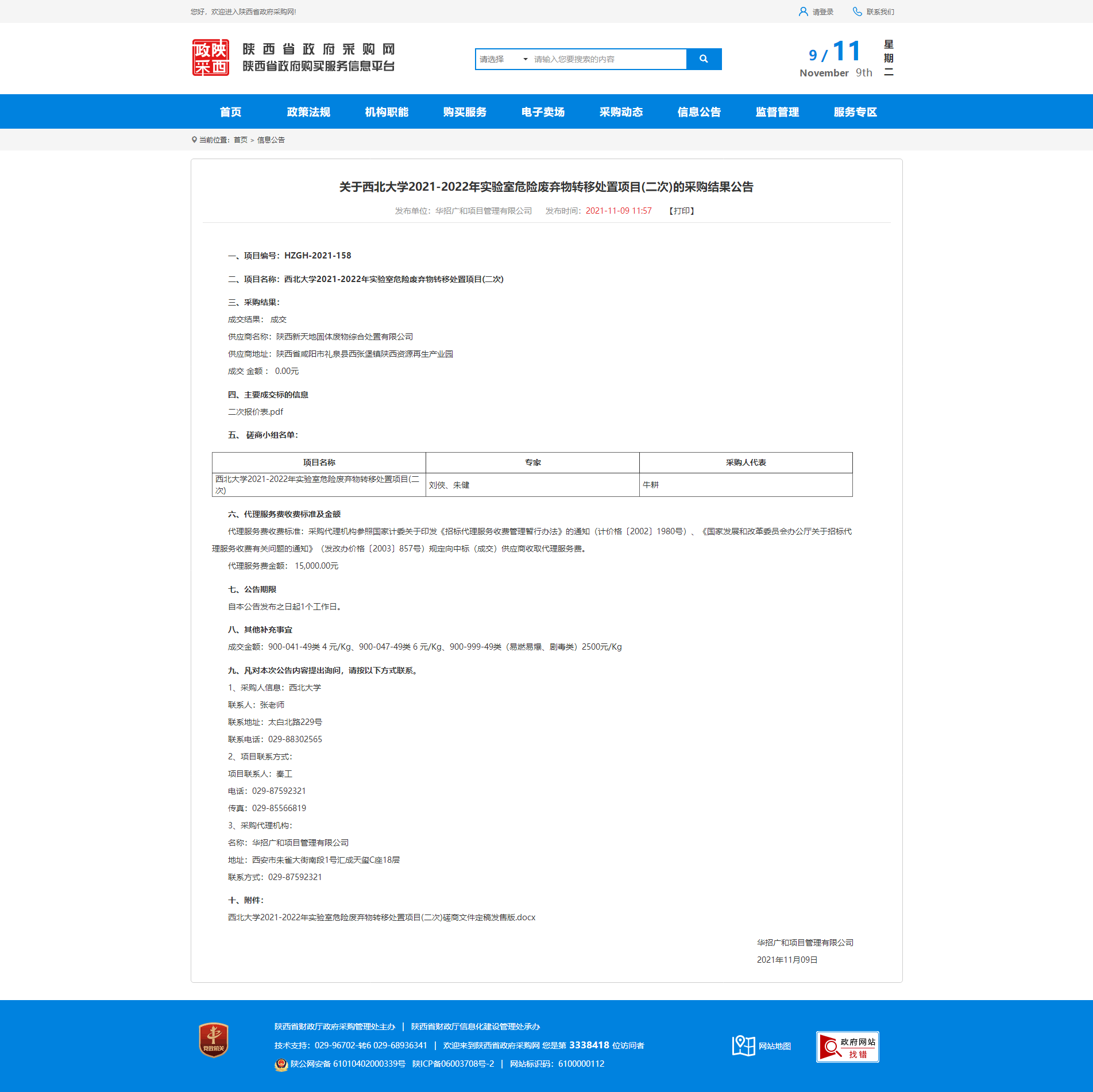 关于乐鱼网页版页面登录2021-2022年实验室危险废弃物转移处置项目(二次)的采购结果公告