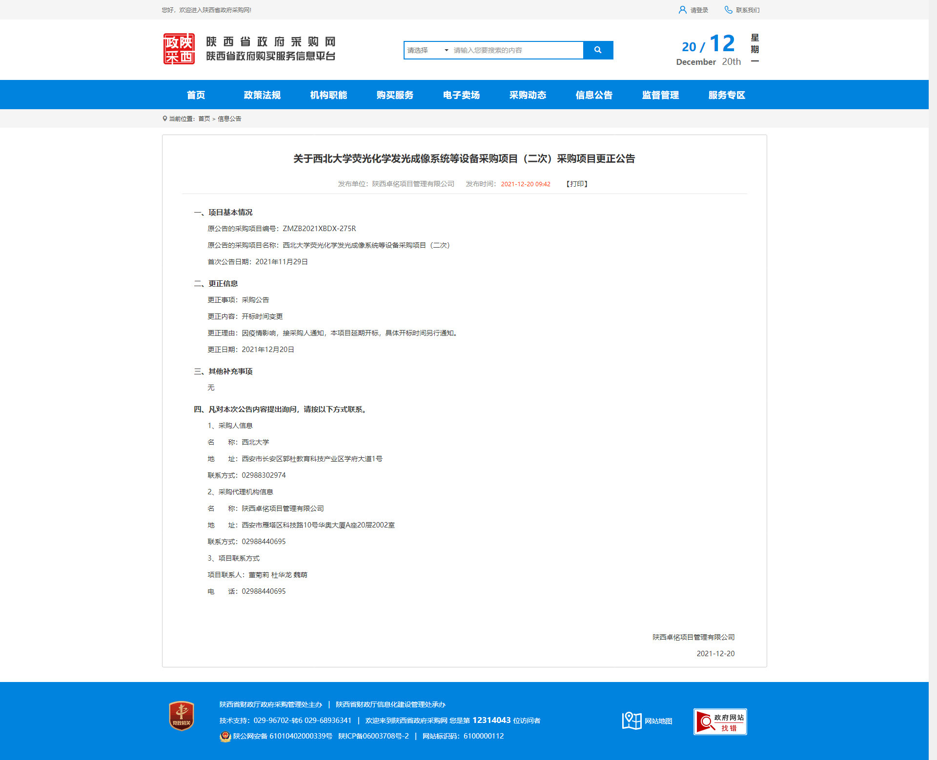 关于乐鱼网页版页面登录荧光化学发光成像系统等设备采购项目(二次)采购项目更正公告 作者: 编辑:薛利娟 时间:2021-12-20 原公告链接:http://www.ccgp-shaanxi.gov.cn/notice/noticeDetail.do?noticeguid=8a85be337dace9ea017dd57d4d013ce2