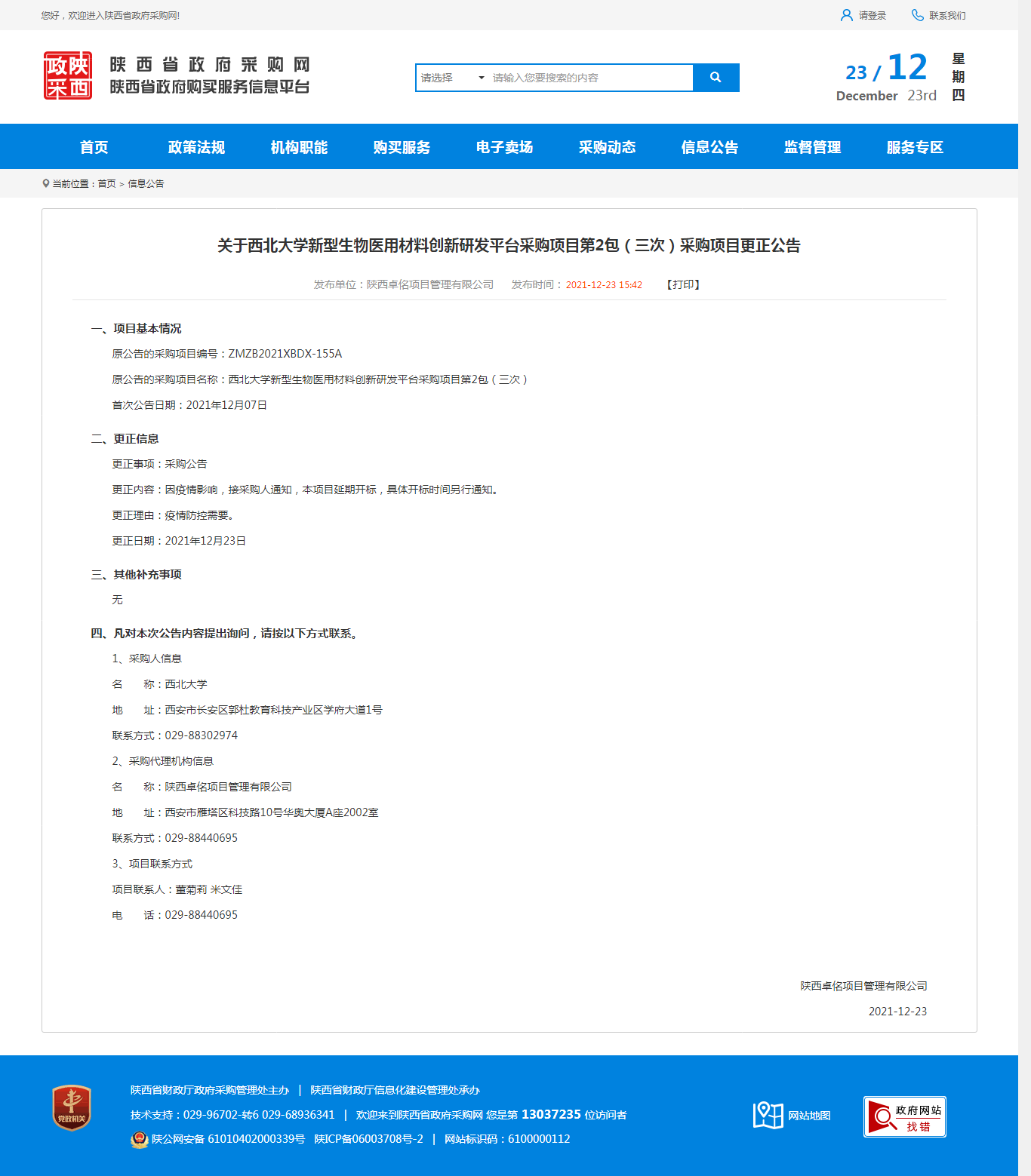 关于乐鱼网页版页面登录新型生物医用材料创新研发平台采购项目第2包(三次)采购项目更正公告 作者: 编辑:薛利娟 时间:2021-12-23 原公告链接:http://www.ccgp-shaanxi.gov.cn/notice/noticeDetail.do?noticeguid=8a85be327dace5d8017de63b467e2efd