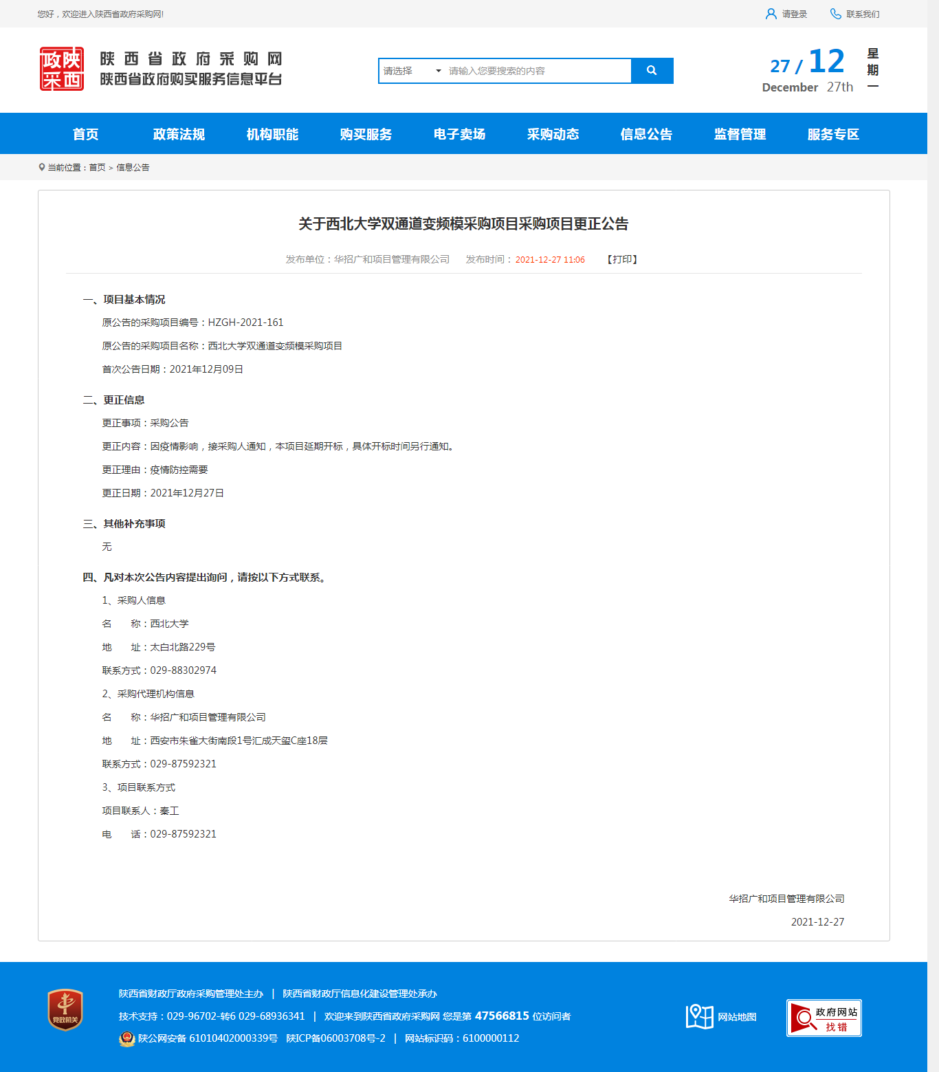 关于乐鱼网页版页面登录双通道变频模采购项目采购项目更正公告 作者: 编辑:薛利娟 时间:2021-12-27 原公告链接:http://ccgp-shaanxi.gov.cn/notice/noticeDetail.do?noticeguid=8a85be347dace9e6017dea8c118f786a