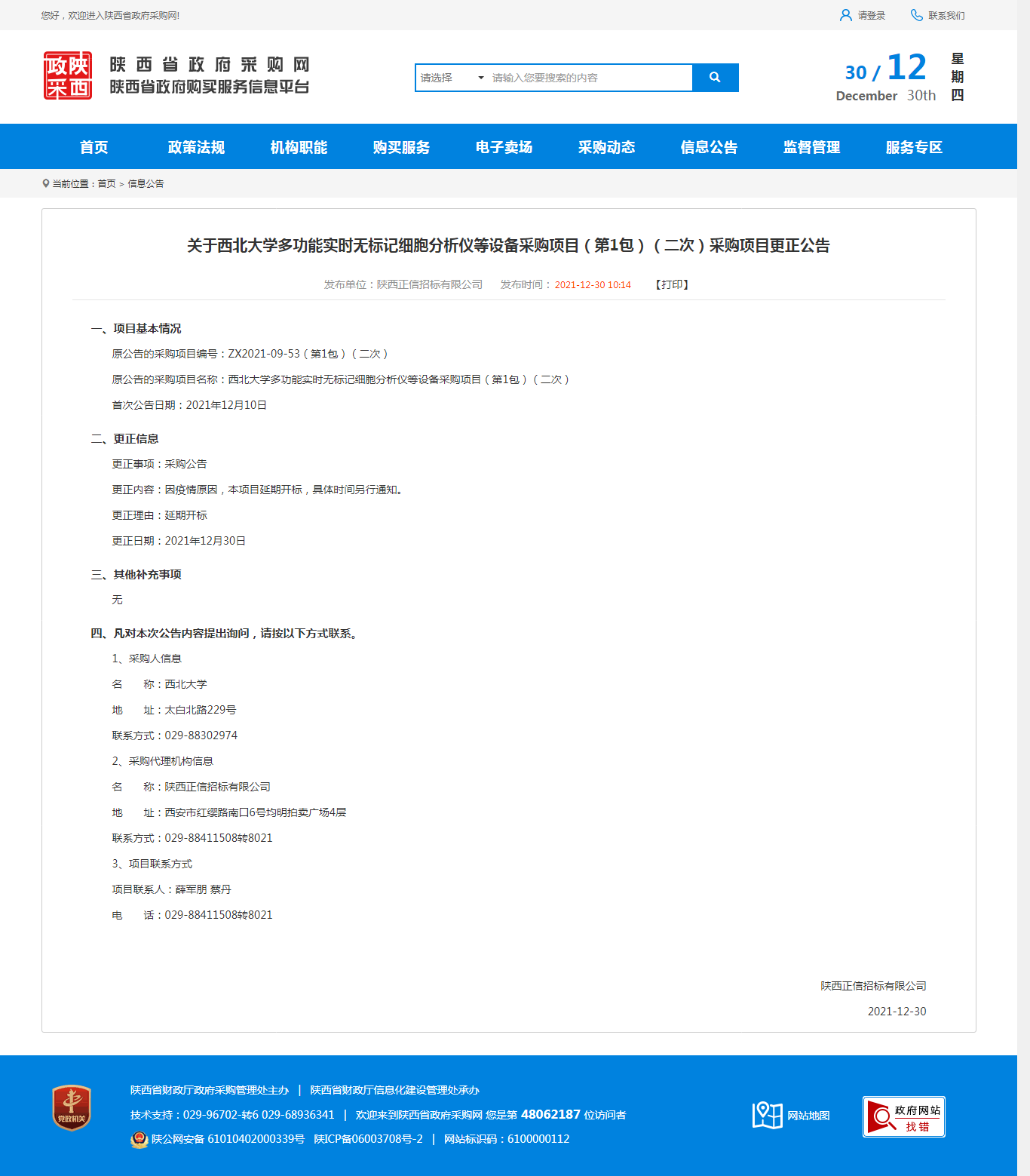 关于乐鱼网页版页面登录多功能实时无标记细胞分析仪等设备采购项目(第1包)(二次)采购项目更正公告 作者: 编辑:薛利娟 时间:2021-12-30 原公告链接:http://www.ccgp-shaanxi.gov.cn/notice/noticeDetail.do?noticeguid=8a85be337debad6b017e09039d8453ea