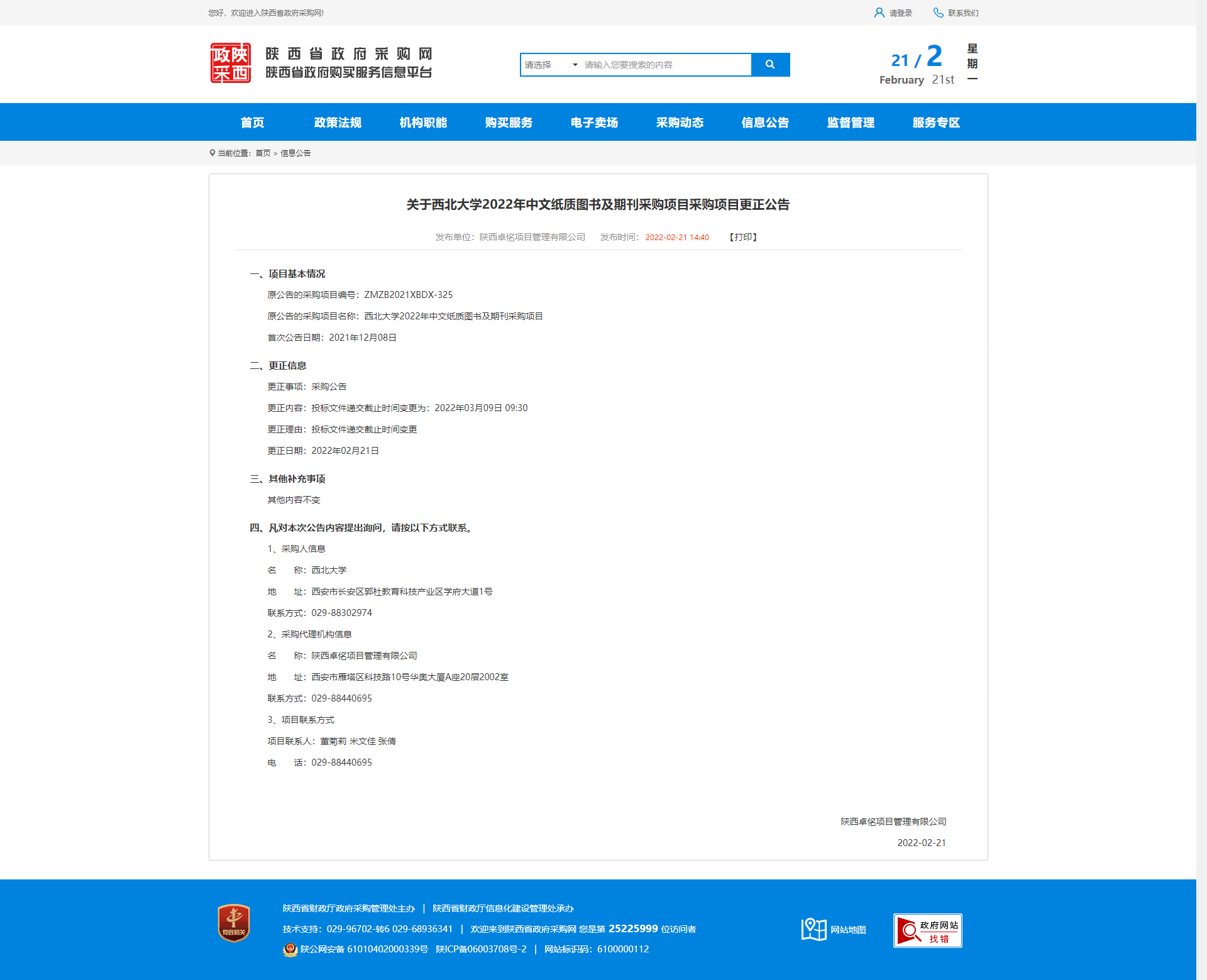 关于乐鱼网页版页面登录2022年中文纸质图书及期刊采购项目采购项目更正公告 作者: 编辑:薛利娟 时间:2022-02-21 原公告地址:http://www.ccgp-shaanxi.gov.cn/notice/noticeDetail.do?noticeguid=8a85be317ee7907d017f1aa113f346e8