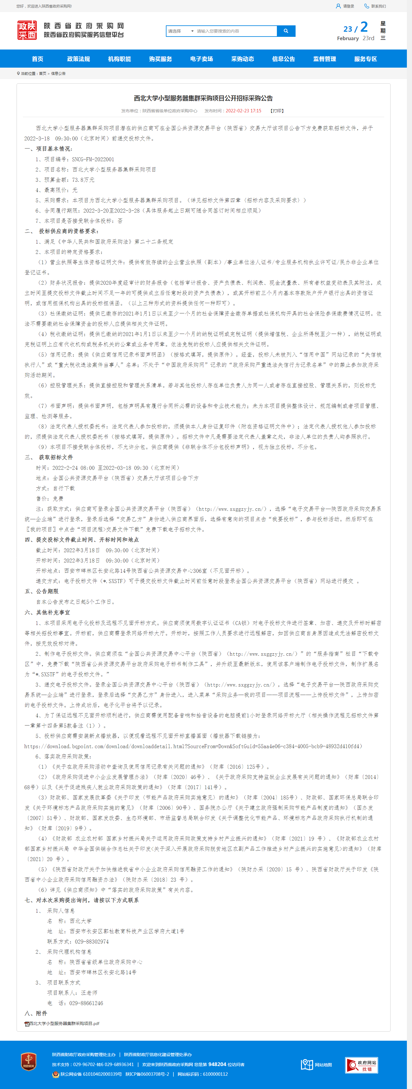 乐鱼网页版页面登录小型服务器集群采购项目公开招标采购公告 作者: 编辑:薛利娟 时间:2022-02-23 原公告链接:http://www.ccgp-shaanxi.gov.cn/notice/noticeDetail.do?noticeguid=8a85be387e22c8ad017f25dab58b0372