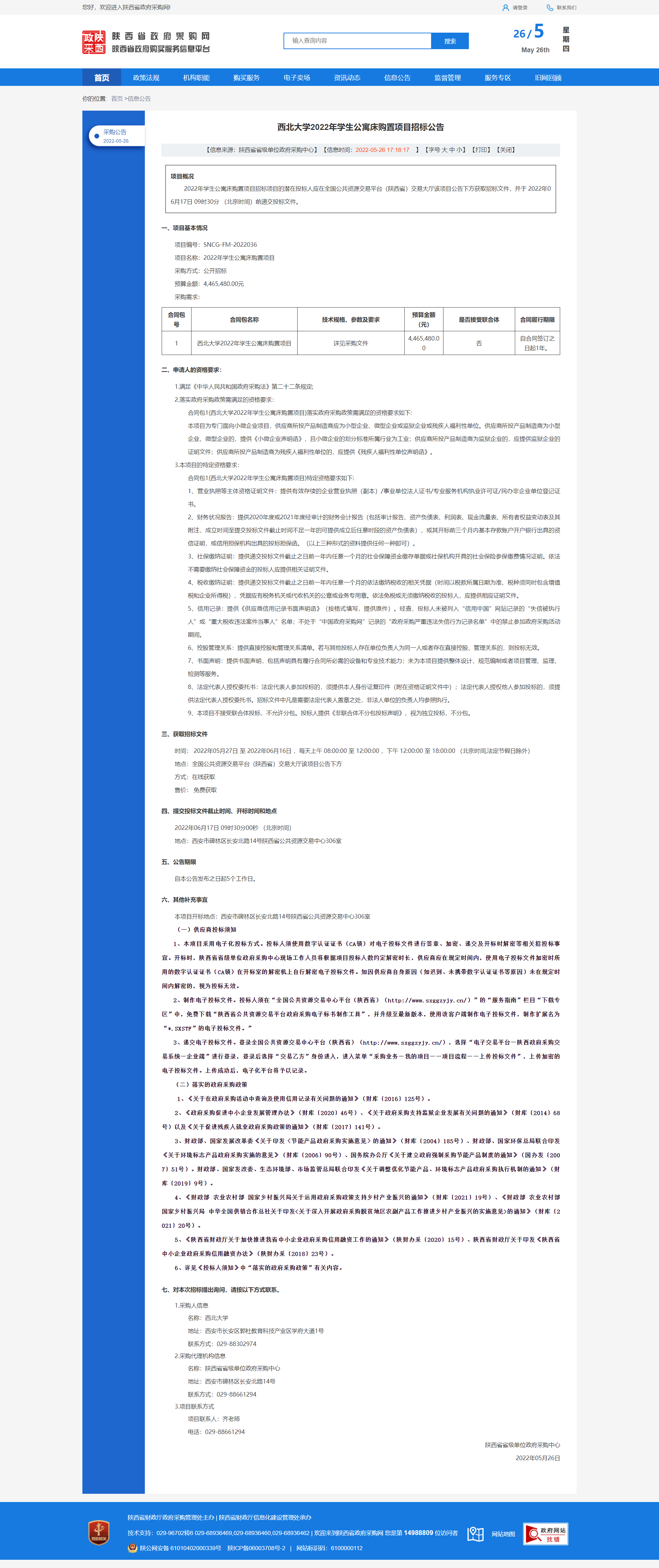 乐鱼网页版页面登录2022年学生公寓床购置项目招标公告 作者: 编辑:薛利娟 时间:2022-05-26 原公告链接:http://www.ccgp-shaanxi.gov.cn/freecms/site/shaanxi/ggxx/info/2022/8a69c34a80cf8c1d0180d6127e5a14f4.html?noticeType=001011¬iceId=0697247a-dcd5-11ec-9a8e-08c0eb20c666