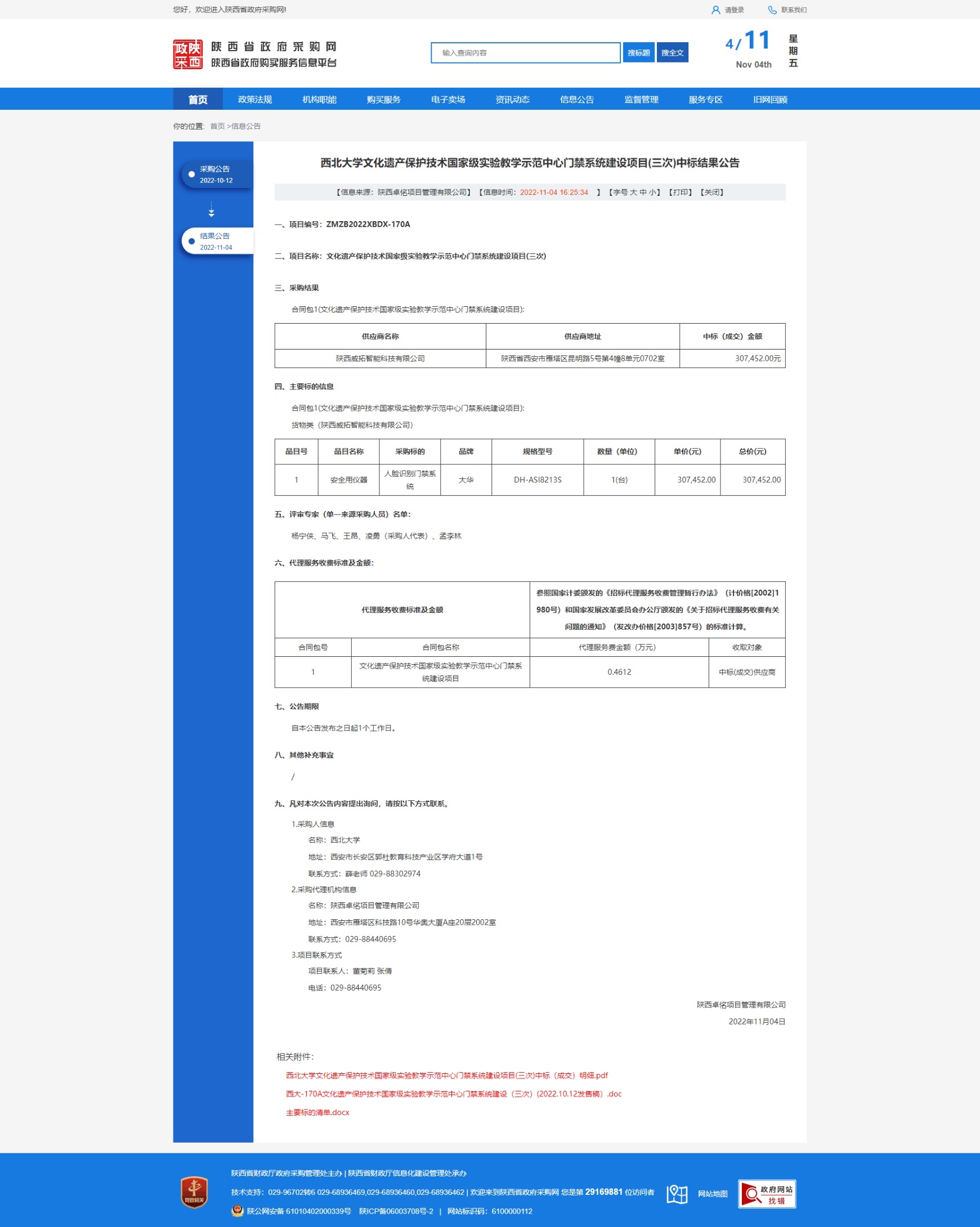 乐鱼网页版页面登录文化遗产保护技术国家级实验教学示范中心门禁系统建设项目(三次)中标结果公告 作者: 编辑:采购与招标办公室 时间:2022-11-04 原公告链接:http://www.ccgp-shaanxi.gov.cn/freecms/site/shaanxi/ggxx/info/2022/8a69c1948405afd90184419c635f2343.html?noticeType=001021¬iceId=de821f62-5c1a-11ed-9a8e-08c0eb20c666