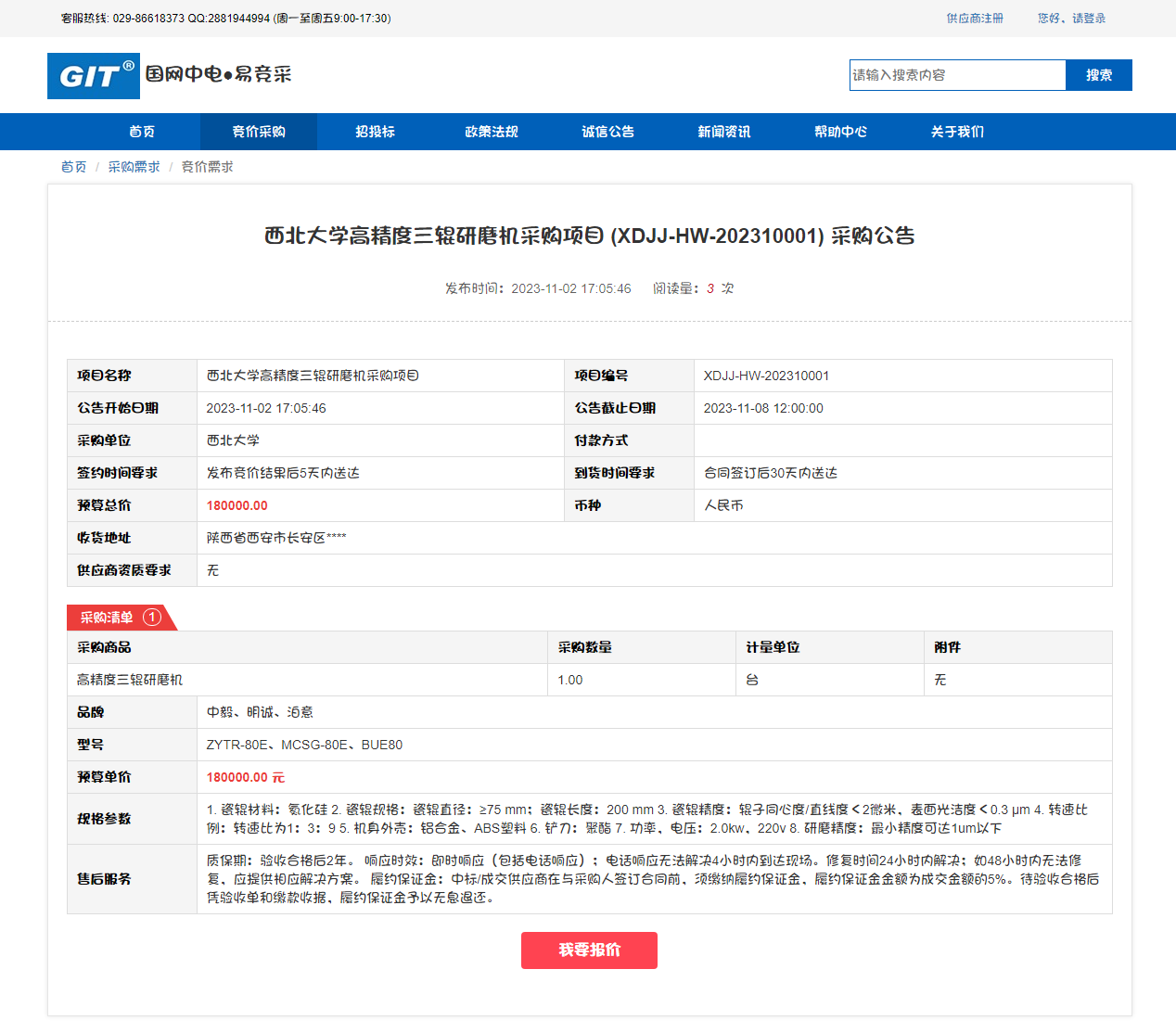 乐鱼网页版页面登录高精度三辊研磨机采购项目竞价公告