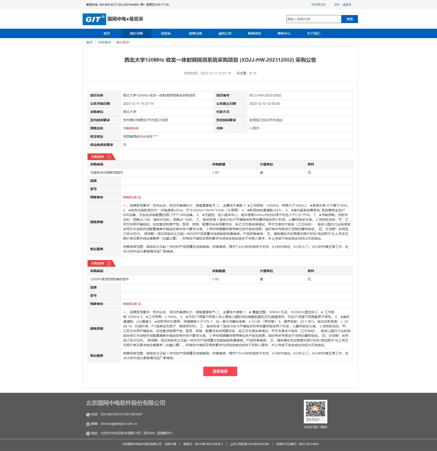 乐鱼网页版页面登录120MHz 收发一体射频探测系统采购项目 (XDJJ-HW-202312002) 采购公告 作者: 编辑: 时间:2023-12-12 原公告链接:https://www.ejingcai.com.cn/site/bidding/detail/7715