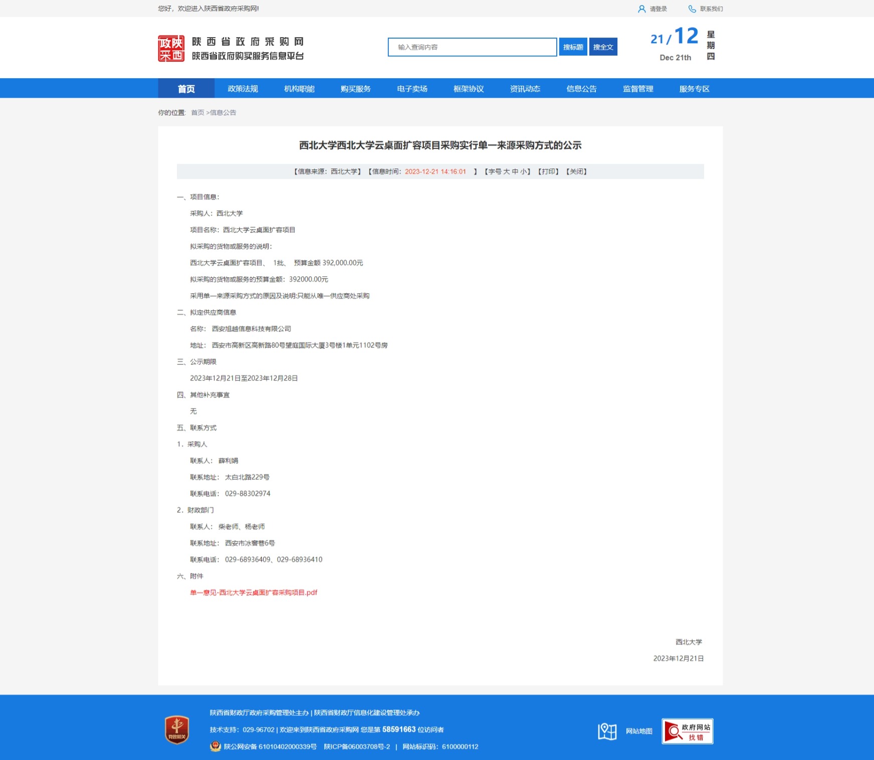 乐鱼网页版页面登录云桌面扩容项目采购实行单一来源采购方式的公示 作者: 编辑:采购与招标办公室 时间:2023-12-21 原公告链接:http://www.ccgp-shaanxi.gov.cn/freecms/site/shaanxi/ggxx/info/2023/8a69c16c8c86bcea018c8afd06910a33.html?noticeType=001051¬iceId=dae76602-9fc9-11ee-9a8e-08c0eb20c666