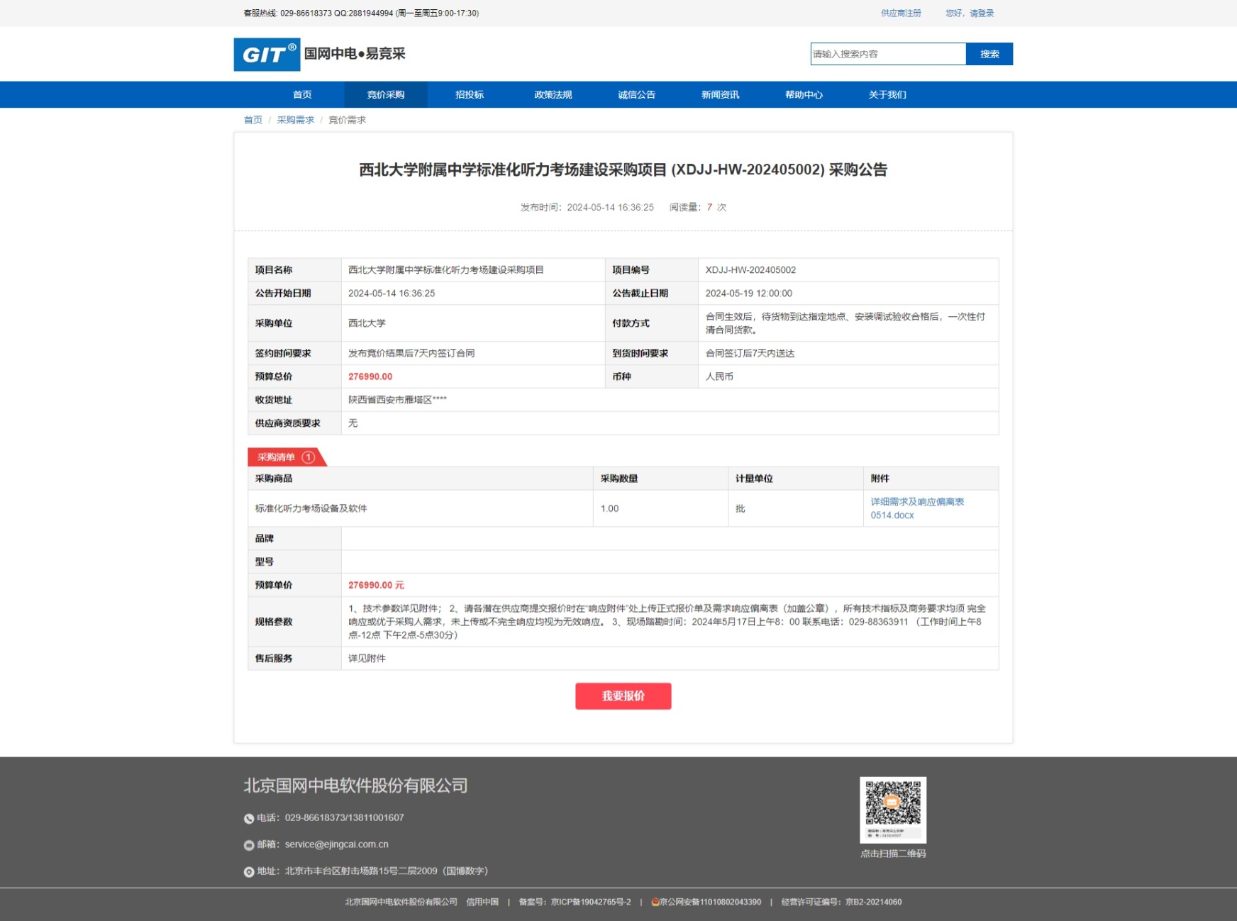 乐鱼网页版页面登录附属中学标准化听力考场建设采购项目 (XDJJ-HW-202405002) 竞价采购公告 作者: 编辑:采购与招标办公室 时间:2024-05-14 原公告链接:https://www.ejingcai.com.cn/site/bidding/detail/10191
