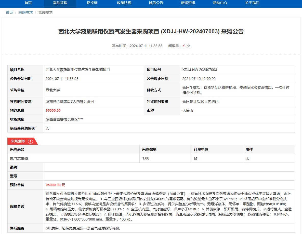 乐鱼网页版页面登录液质联用仪氮气发生器采购项目 (XDJJ-HW-202407003) 竞价采购公告 作者: 编辑: 时间:2024-07-11 原公告链接:https://www.ejingcai.com.cn/site/bidding/detail/11611