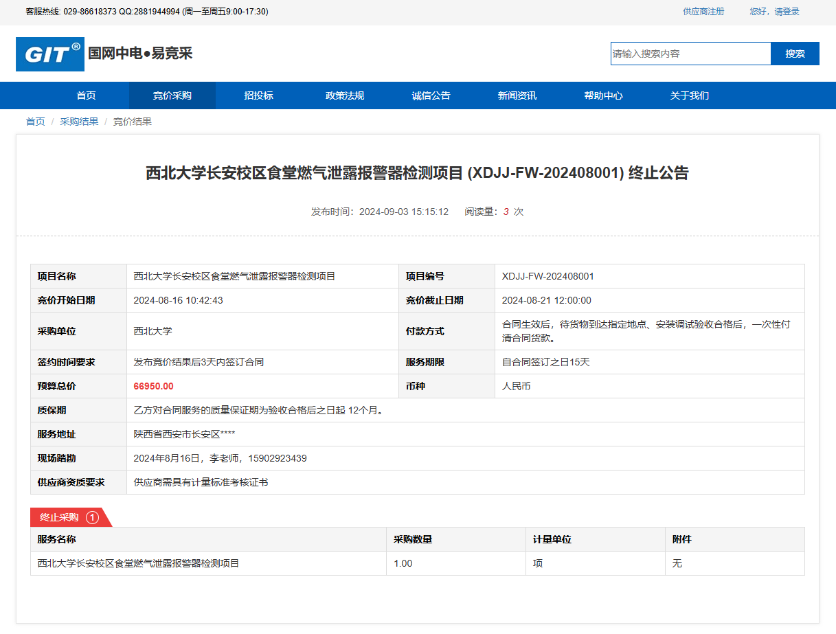 乐鱼网页版页面登录长安校区食堂燃气泄露报警器检测项目 (XDJJ-FW-202408001) 竞价终止公告 作者: 编辑: 时间:2024-09-03 原公告链接:https://www.ejingcai.com.cn/site/bidding/detail/12307