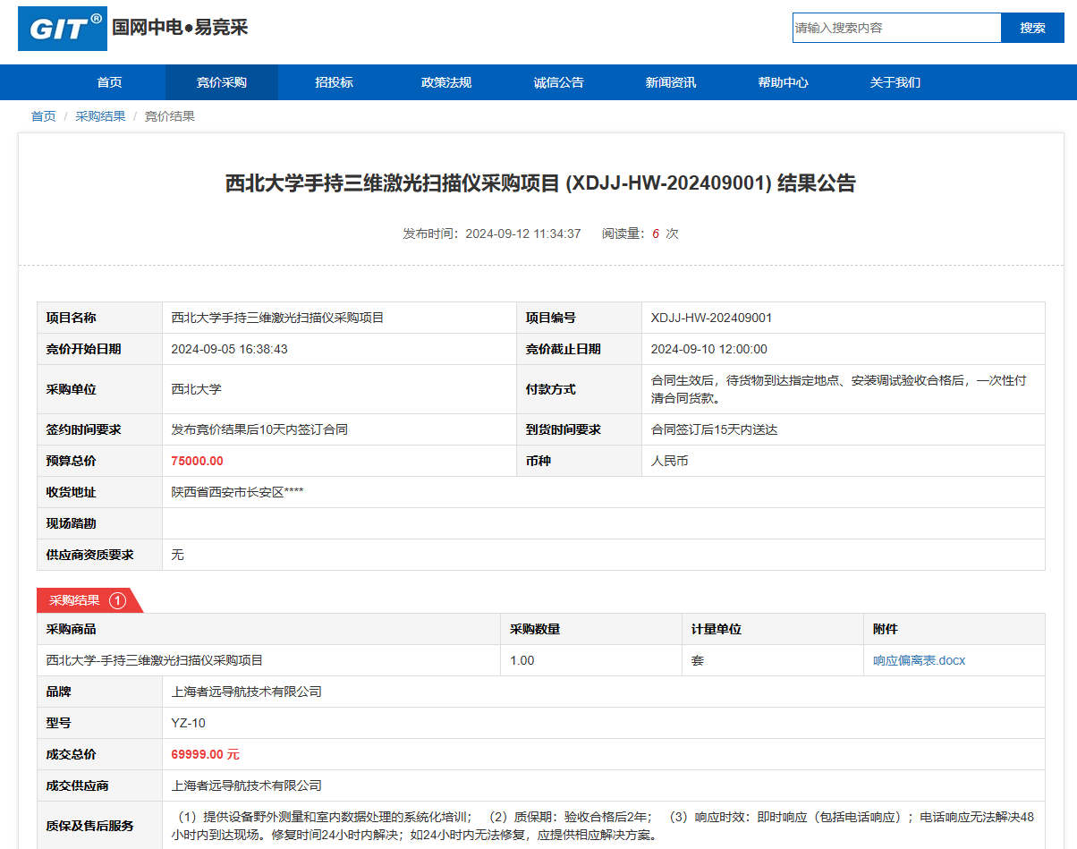 乐鱼网页版页面登录手持三维激光扫描仪采购项目 (XDJJ-HW-202409001)竞价结果公告 作者: 编辑: 时间:2024-09-12 原公告链接:https://www.ejingcai.com.cn/site/bidding/detail/12516