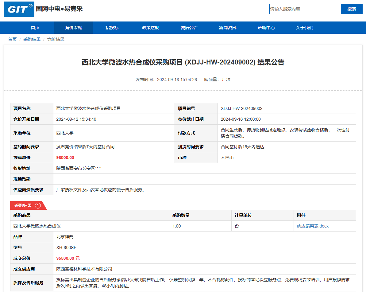乐鱼网页版页面登录微波水热合成仪采购项目 (XDJJ-HW-202409002)竞价结果公告 作者: 编辑: 时间:2024-09-18 原公告链接:https://www.ejingcai.com.cn/site/bidding/detail/12667