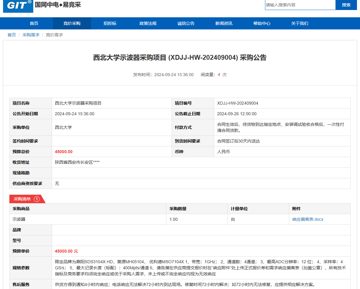 乐鱼网页版页面登录示波器采购项目 (XDJJ-HW-202409004)竞价采购公告 作者: 编辑: 时间:2024-09-24 原公告链接:https://www.ejingcai.com.cn/site/bidding/detail/12860