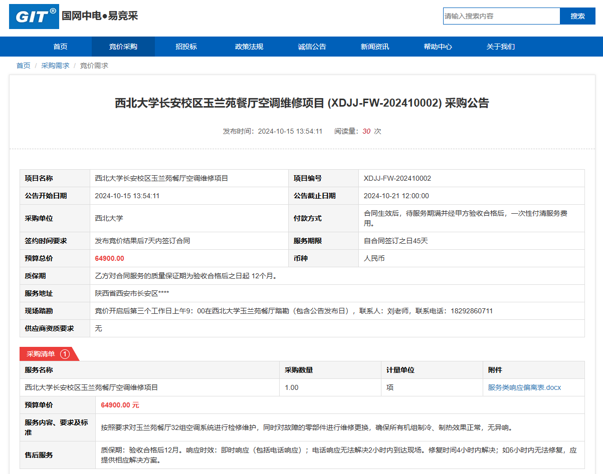 乐鱼网页版页面登录长安校区玉兰苑餐厅空调维修项目(XDJJ-FW-202410002)竞价采购公告 作者:采购与招标办公室 编辑: 时间:2024-10-15 原公告链接:https://www.ejingcai.com.cn/site/bidding/detail/13316