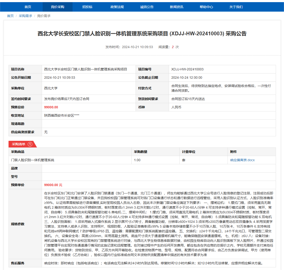 乐鱼网页版页面登录长安校区门禁人脸识别一体机管理系统采购项目(XDJJ-HW-202410003)竞价采购公告 作者:采购与招标办公室 编辑: 时间:2024-10-21 原公告链接:https://www.ejingcai.com.cn/site/bidding/detail/13531