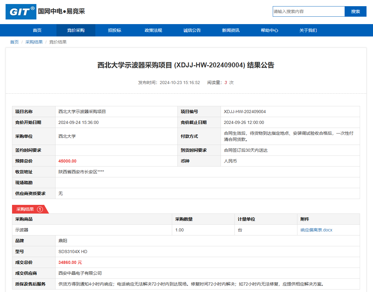 乐鱼网页版页面登录示波器采购项目(XDJJ-HW-202409004)竞价结果公告 作者:采购与招标办公室 编辑: 时间:2024-10-23 原公告链接:https://www.ejingcai.com.cn/site/bidding/detail/13693