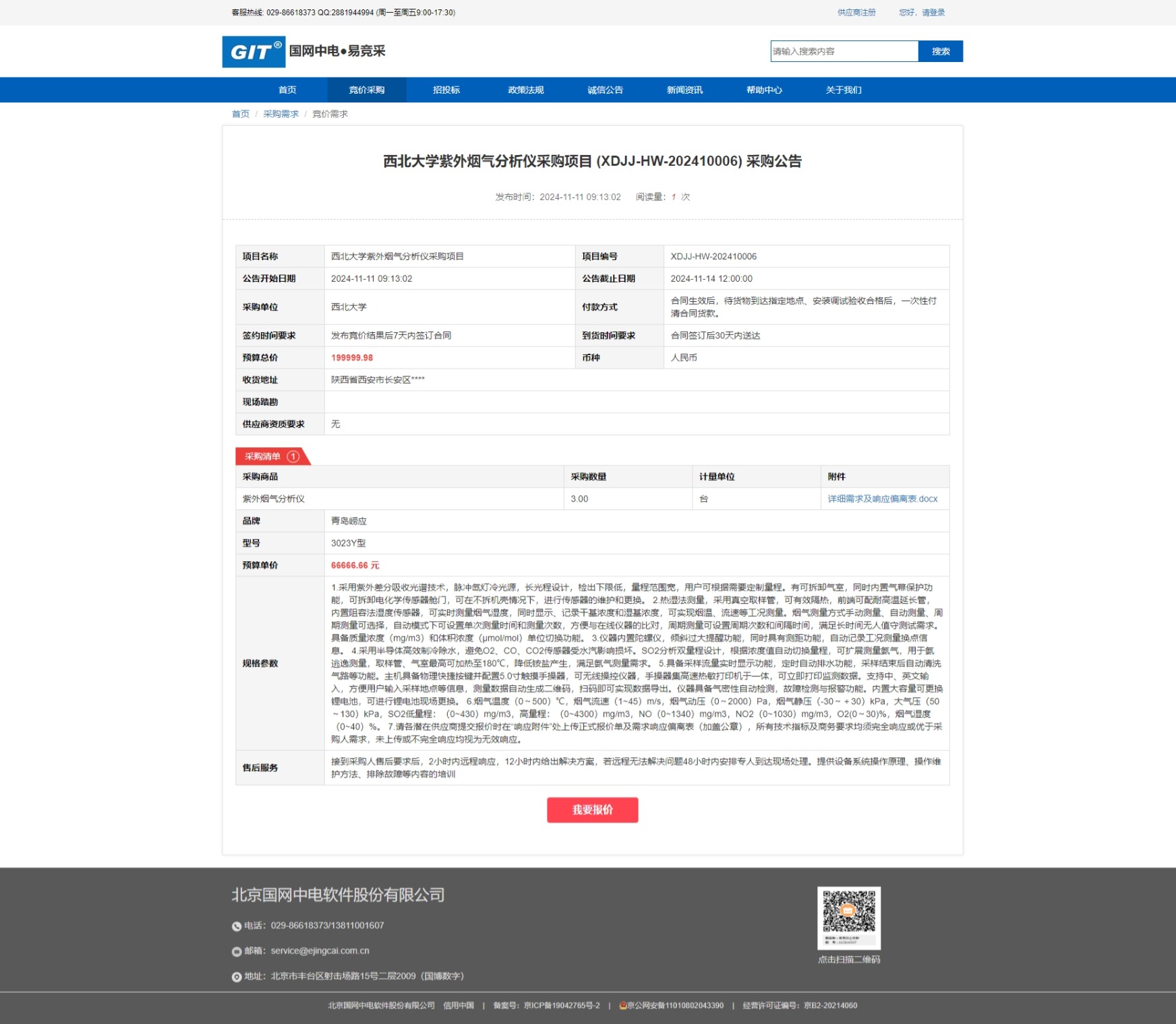 乐鱼网页版页面登录紫外烟气分析仪采购项目 (XDJJ-HW-202410006) 竞价采购公告 作者: 编辑:采购与招标办公室 时间:2024-11-11 原公告链接:https://www.ejingcai.com.cn/site/bidding/detail/14592
