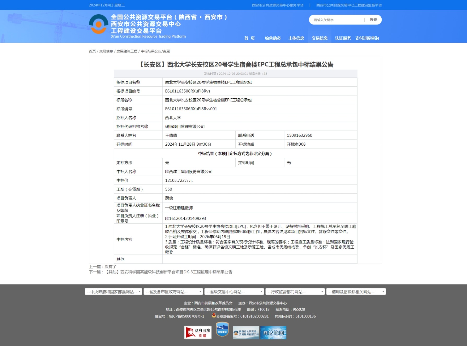 乐鱼网页版页面登录长安校区20号学生宿舍楼EPC工程总承包中标结果公告